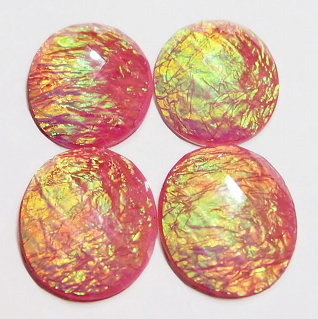 You are buying 4 of 40x30 mm Acrylic Faceted Cameos. These look like opals but are made of Acrylic. You will see all different colors every way you turn or look at them. The base is Pink but the Yellow and orange come through, very pretty. These are really nice. The molding process of these are just great, no flaws. You can use these Horizontal or Vertical. These measure 40 mm x 30 mm & are all Faceted with beautiful colors. I have several different settings these will fit in. They look very detailed for their size. I have lots of Great Bails, Bracelets, Cameos, Chains, Connectors, Jump Rings, Lockets, Pendants, Pins, Rings & Settings so, just look at all my listings. These are included in a group of 8 different Colors as shown in the last picture item #360883058804, sold separately. I also offer 2 Colors similar to these in 25x18 mm item #111721185172.