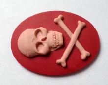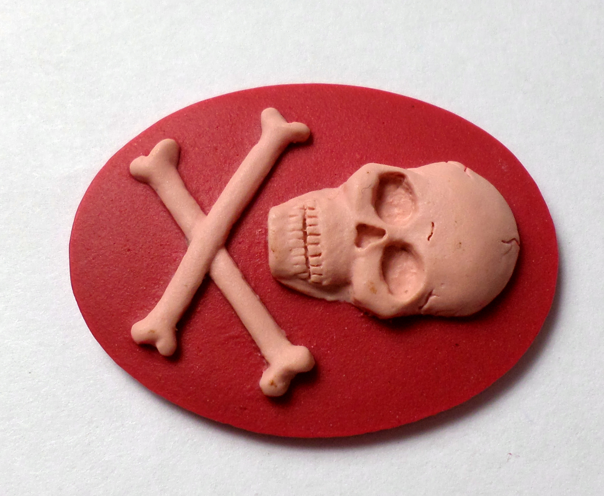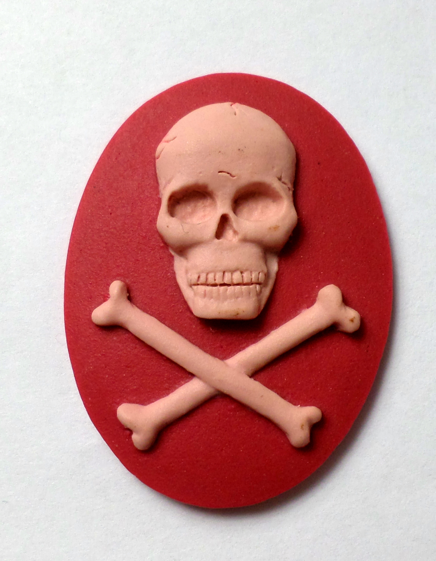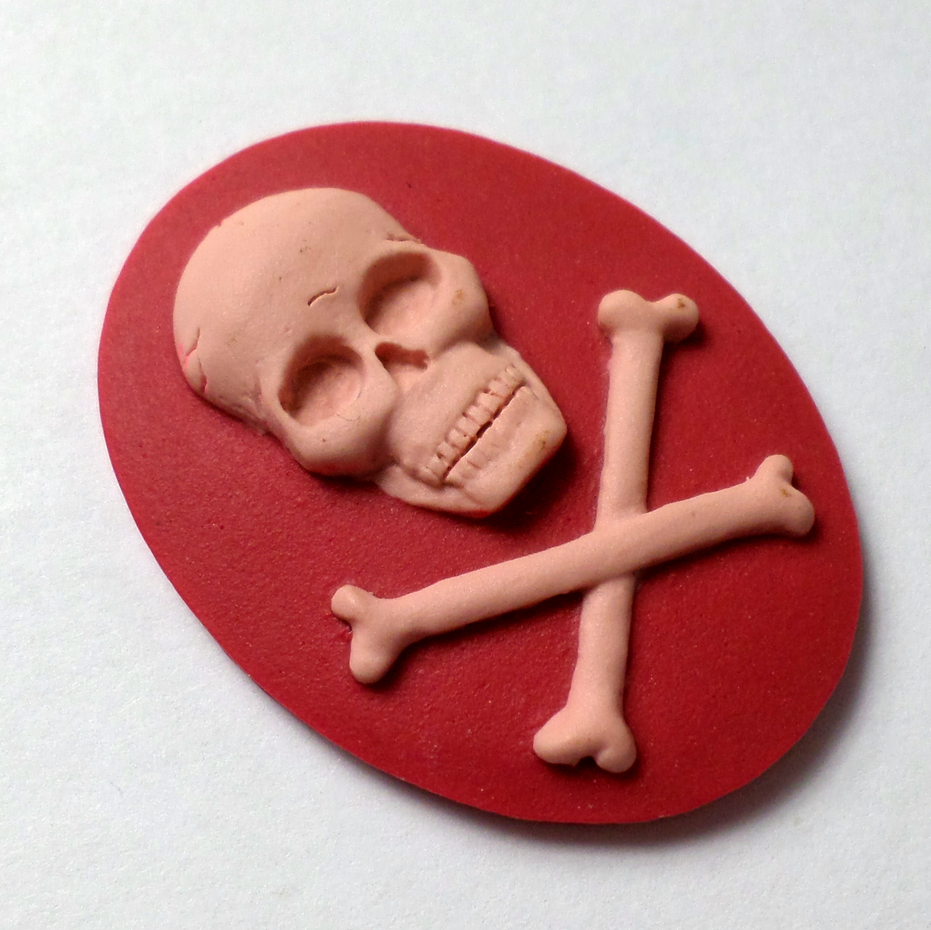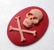 You are buying 4 of 40 mm x 30 mm Pink over Plum Skull & Cross Bones Cameos. They are of the Gothic Skull and Cross Bones Pirates beware, the molding is very well done. They are a COOL Pink over Plum Color Background. They measure 40 mm x 30 mm. I have them in all sorts of colors, so check my other listings. These look very detailed for their size, in fact, they stand out from the background to give it a 3-D look. They have never been used. I have lots of Great Bails, Bracelets, Cameos, Chains, Connectors, Jump Rings, Lockets, Pendants, Pins, Rings & Settings so, just look at all my listings. These are also offered in a group of 10 different skull and crossbones and pirate cameos as shown in the last picture item #360747497265, sold separately. I also have several Colors in this theme in 25x18 mm Cameos.