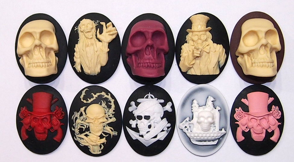 You are buying 4 of 40 mm x 30 mm Purple over Black 3-D Looking Zombie or Pirate Skull Head Cameos. They are of a Skull, the molding is excellent. They are a Purple on a Black Background. I really like the color combination. They measure 40 mm x 30 mm. They look very detailed for their size, in fact, they stand WAY OUT from the background to give it a 3-D look. They have never been used. I have lots of Great Bails, Bracelets, Cameos, Chains, Connectors, Jump Rings, Lockets, Pendants, Pins, Rings & Settings so, just look at all my listings. I have these in 2 other Colors, cream over black is Item # 360471676497 and the cream over brown is Item # 110911243368 & in a group of 4 Colors with one being a Glass Cameo as shown in the next to last picture item #360949015532 & in a group of 10 different zombies & pirates 40x30 mm Cameos as shown in the last picture item #360747442844.