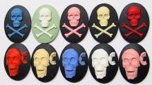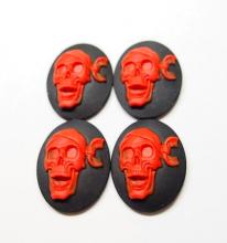 You are buying 4 of 40 mm x 30 mm Red over Black Skull Head & Bandana Cameos. They are of a Skull with his Bandana on, Pirates beware, the molding is very well done. They are Red on a Black Background. I really like the color combination. They measure 40 mm x 30 mm. I have them in all sorts of colors and sizes, so check my other listings. They look very detailed for their size, in fact, they stand out from the background to give it a 3-D look. They have never been used. I have lots of Great Bails, Bracelets, Cameos, Chains, Connectors, Jump Rings, Lockets, Pendants, Pins, Rings & Settings so, just look at all my listings. These are also offered in a group of 10 different skull and crossbones and pirate cameos as shown in the last picture item #360747497265, sold separately. I also have several Colors in this theme in 25x18 mm Cameos.