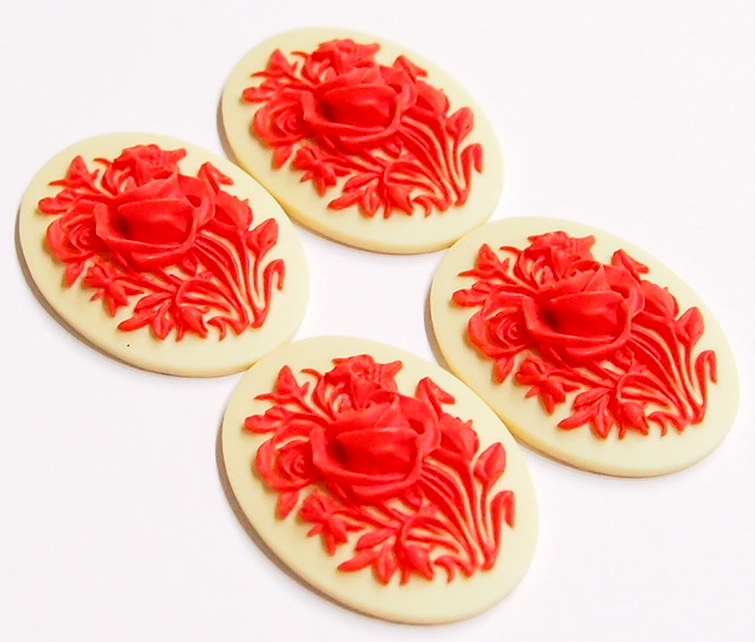 You are buying 4 of 40 mm x 30 mm Red over Cream Bunches of Wild Roses Cameos. These are so gorgeous, they are a group of Wild Roses with the Roses being Red and the background is a Cream Color. The wild Flowers takes up most of the whole cameo. The molding process of these are just great, no flaws. The details are very sharp and stand away from the background, giving it a 3-D effect. I have several different settings these will fit in. They measure 40 mm x 30 mm. They look very detailed for their size. I have lots of Great Bails, Bracelets, Cameos, Chains, Connectors, Jump Rings, Lockets, Pendants, Pins, Rings & Settings so, just look at all my listings. I also offer a group of 4 Colors of 40x30 mm Roses Cameos as shown in the next to last picture item #111368825037. I have these in 1 other Color & in a group of 12 Colors as shown in the last picture item #110911248686. I offer an assortment of 10 gorgeous 25x18 mm flower Cameos item #360929722102. Also offered is a group of 12 Colors in 18x13 mm item #111005686356 and my group of 6 Colors in 10x8 mm is item #110911253395.