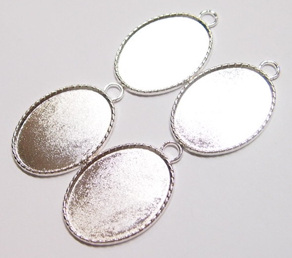 You are buying 4 of 40 mm x 30 mm Silver Plated Small Rope Edge Pendant Settings. These settings are originally from the 1900-1930's, I only had a few left and found a company to make these for me and they are gorgeous. The top has a nice size loop(5.8 mm) for your Chain or Cord or Jump Ring (which I have 3 Colors & 2 Sizes of) and you can always add a pin on the back if you desire a brooch too. The back side is really nice with a star burst pattern on it, you could glue another cameo or cab on the backside and have a double sided Pendant. Since they have a solid 40 mm x 30 mm backing you could go down in size a little if you had an odd size cameo or cab to try & fit. These have never been used, very nice looking and solidly made. Cabs or Cameos will have to be glued in, no prongs. I have lots of Great Bails, Bracelets, Cameos, Chains, Connectors, Jump Rings, Lockets, Pendants, Pins, Rings & Settings so, just look at all my listings. I have these in 3 other Colors & in a group of 4 Colors as shown in the last picture item #110911244561. I have lots of other settings in this size & 25x18 like these in 4 Colors & styles.