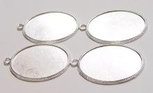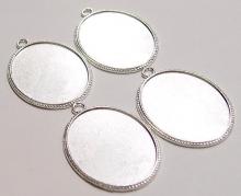 You are buying 4 of 40 mm x 30 mm Silver Plated Beaded Band Pendant Settings. These are very sturdy with a small beaded design around the edge. These will work great for any cameos or cabs, they will have to be glued in. The top has a nice size loop (3.5 mm) for your Chain or Cord or Jump Ring (which I have 3 Colors & 2 Sizes of). Actual size of the setting is 39.3 mm x 29.3 mm. If you have an exact 40x30 Cameo or Cab what I do is take a nail file and sand around the edges just a bit to make whatever you are setting into these fit. The biggest size that will fit in these are 39.3 x 29.3 mm. Since they are a solid back, you could go down in size a little if you had an odd size cameo or cab to try & fit. They have never been used, very nice looking. I have lots of Great Bails, Bracelets, Cameos, Chains, Connectors, Jump Rings, Lockets, Pendants, Pins, Rings & Settings so, just look at all my listings. I have these in 3 other Colors & in a group of 4 Colors as shown in the next to last picture item #111357381749. Also offered is a similar group of 40x30 mm small rope edge settings as shown in the last picture item #110911244561.