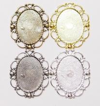 You are buying 4 of 40 mm x 30 mm Shiny Silver Plated Victorian Art Deco Oval Loop Pendant Settings. They have a nice Victorian loop shape all around the setting and the top has a nice size loop (3.7 mm) for your Chain or Cord or Jump Ring (which I have 3 Colors & 2 Sizes of). The back side is really nice with a star burst pattern on it, you could glue another cameo or cab on the backside and have a double sided pendant. Since they are a solid back, you could go down in size a little if you had an odd size cameo, cabochon, glass, or whatever you want to try & fit. These have never been used, very nice looking and solidly made. I have lots of Great Bails, Bracelets, Cameos, Chains, Connectors, Jump Rings, Lockets, Pendants, Pins, Rings & Settings so, just look at all my listings. I have these in 3 other Colors & in a group of 4 Colors as shown in the last picture item #110911242485, sold separately.