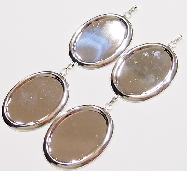 You are buying 4 of 40 mm x 30 mm Shiny Silver Plated Simple Design Pendant Settings. These are lightweight & sturdy. These will work great for any cameos or cabs, they will have to be glued in. The biggest size that will fit in these are 40 mm x 30 mm. Since they are a solid back, you could go down in size a little if you had an odd size cameo or cab to try & fit. They have never been used, very nice looking. I have lots of Great Bails, Bracelets, Cameos, Chains, Connectors, Jump Rings, Lockets, Pendants, Pins, Rings & Settings so, just look at all my listings. I have these in 2 other Colors & in a group of 7 Colors as shown in the last picture item #110911248607. I have all of these designs in other size Bracelets, Rings & Settings.