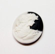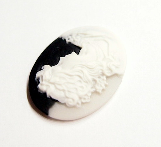 You are buying 4 of 40 mm x 30 mm White on Black & Gray Wispy Hair Woman Cameos. They are of a Victorian Lady, very elegant Looking with wispy hair and flowers in her hair facing right, the molding is very well done. They are White that is over two tone color of gray and black background, I really like how the color is done. They measure 40 mm x 30 mm. They look very detailed for their size, in fact, the Lady stands out from the background to give it a 3-D look. I have lots of Great Bails, Bracelets, Cameos, Chains, Connectors, Jump Rings, Lockets, Pendants, Pins, Rings & Settings so, just look at all my listings.