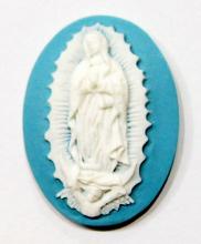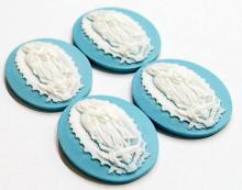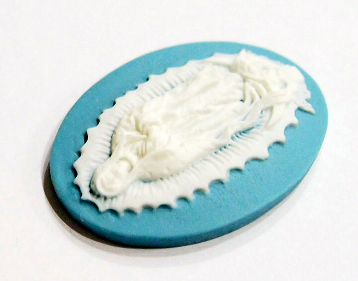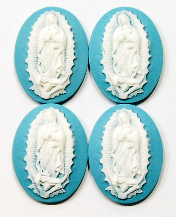 You are buying 4 of 40 mm x 30 mm White over Aqua Blue Lady of Guadalupe Cameos. These are so gorgeous, this shows Our Lady of Guadalupe. These are white color on a gorgeous Aqua Blue background, she is outline in White. The molding process of these are just great, no flaws. They look very detailed for their size. I have lots of Great Bails, Bracelets, Cameos, Chains, Connectors, Jump Rings, Lockets, Pendants, Pins, Rings & Settings so, just look at all my listings. I also have these in Cream over Black item #110911242402. These are also offered in a group of 8 different religious themed 40x30 mm resin cameos as shown in the last picture item #111126962531, sold separately.