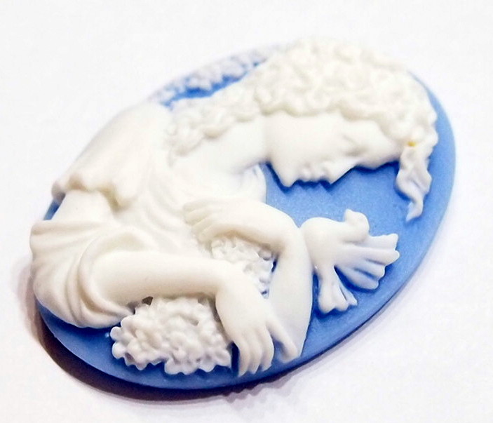 You are buying 4 of 40 mm x 30 mm White over Baby Blue Floral Woman with Bird Cameos. These are so gorgeous, they show a woman with a floral arrangement in the back of her hair holding a bird. She is white on a Baby Blue color background. The details are very sharp and stand away from the background, giving it a 3-D effect. These measure 40 mm x 30 mm. The molding process of these are just great, no flaws. I have several different settings these will fit in. These are pretty fabulous. They look very detailed for their size. I have lots of Great Bails, Bracelets, Cameos, Chains, Connectors, Jump Rings, Lockets, Pendants, Pins, Rings & Settings so, just look at all my listings. I have these in 1 other Color & in a group of 5 Colors as shown in the next to last picture item #360946006408, sold separately. I also have a Group of 6 Grecian Muse Woman with Bird Cameos item #110911248601 as shown in the last picture, sold separately.