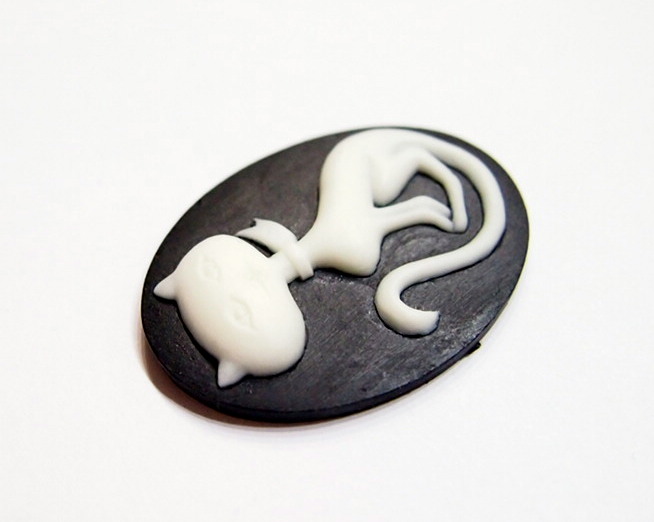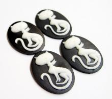 You are buying 4 of 40 mm x 30 mm White over Black Sitting Big Head Cat with Bow Cameos. They are of a full body cat with a big 3-D head and a bow around the neck, these are molded. The images stand out from the cameo to give them the 3-d effect. They are a White over a Black background and they measure 40 mm x 30 mm. They look very detailed for their size. I have lots of Great Bails, Bracelets, Cameos, Chains, Connectors, Jump Rings, Lockets, Pendants, Pins, Rings & Settings so, just look at all my listings. I have Cats in 2 other Colors (Cream over Black item #111005276120 and Brown over White item #360575430145) as shown in the next to last 2 pictures and both are sold separately. I also have a group of 6 Colors of round Cats as shown in the last picture item #360471675604 and are also sold separately.