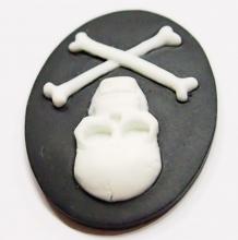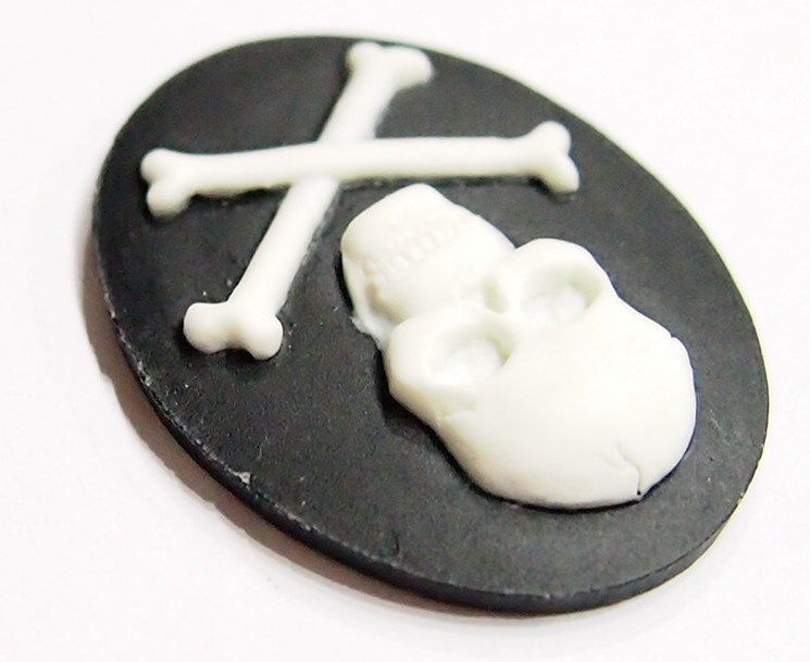 You are buying 4 of 40 mm x 30 mm White over Black Skull & Cross Bones Cameos. They are of the Gothic Skull and Cross Bones Pirates beware, the molding is very well done. They are a COOL White over Black Background. They measure 40 mm x 30 mm. I have them in all sorts of colors, so check my other listings. These look very detailed for their size, in fact, they stand out from the background to give it a 3-D look. They have never been used. I have lots of Great Bails, Bracelets, Cameos, Chains, Connectors, Jump Rings, Lockets, Pendants, Pins, Rings & Settings so, just look at all my listings. I also offer a group of 10 different skull and crossbones and pirate cameos as shown in the last picture item #360747497265, sold separately. I also have several Colors in this theme in 25x18 mm Cameos.