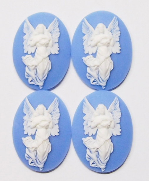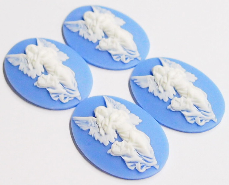 You are buying 4 of 40 mm x 30 mm White over Blue Flying Angel Cameos. They are of a Beautiful Standing or flying Full body Angel, she is just gorgeous and are very hard to find, these are molded. The details are very sharp and stand away from the background, giving it a 3-D effect. They are a white color to a Baby blue color background. They measure 40x30 mm. They look very detailed for their size. I have lots of Great Bails, Bracelets, Cameos, Chains, Connectors, Jump Rings, Lockets, Pendants, Pins, Rings & Settings so, just look at all my listings. I have these in 9 other Colors & in a group of 10 Colors as shown in the next to last picture item #360601358717, sold separately. I also have a Glass 40x30 Angel that is amazing as shown in the last picture item #111563956363, sold separately.