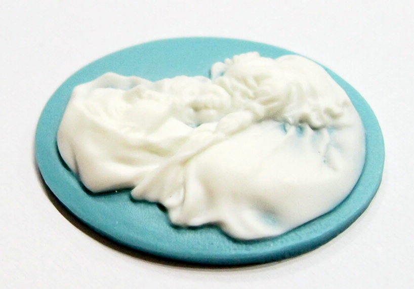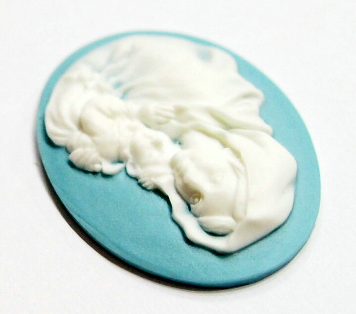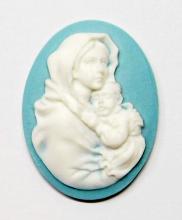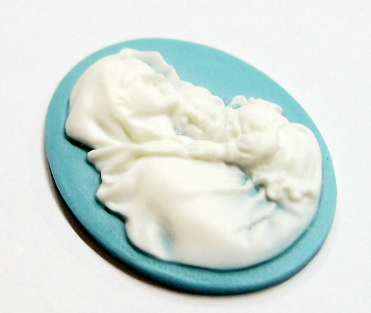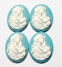 You are buying 4 of 40 mm x 30 mm White over Blue Virgin Mary Cradling Baby Jesus Cameos. They are of the Beautiful Virgin Mary with baby Jesus, held tight to her shoulder, these are molded. These stand out from the cameo to give them the 3-d effect. They are a White over a blue background. These are simply gorgeous and show Mary cradling her Jesus. They look very detailed for their size. I have lots of Great Bails, Bracelets, Cameos, Chains, Connectors, Jump Rings, Lockets, Pendants, Pins, Rings & Settings so, just look at all my listings. I have these in 1 other Color & in a group of 10 Colors as shown in the last picture item #111126962531, sold separately. I have more of this style in 40x30 mm & in 25x18 mm.