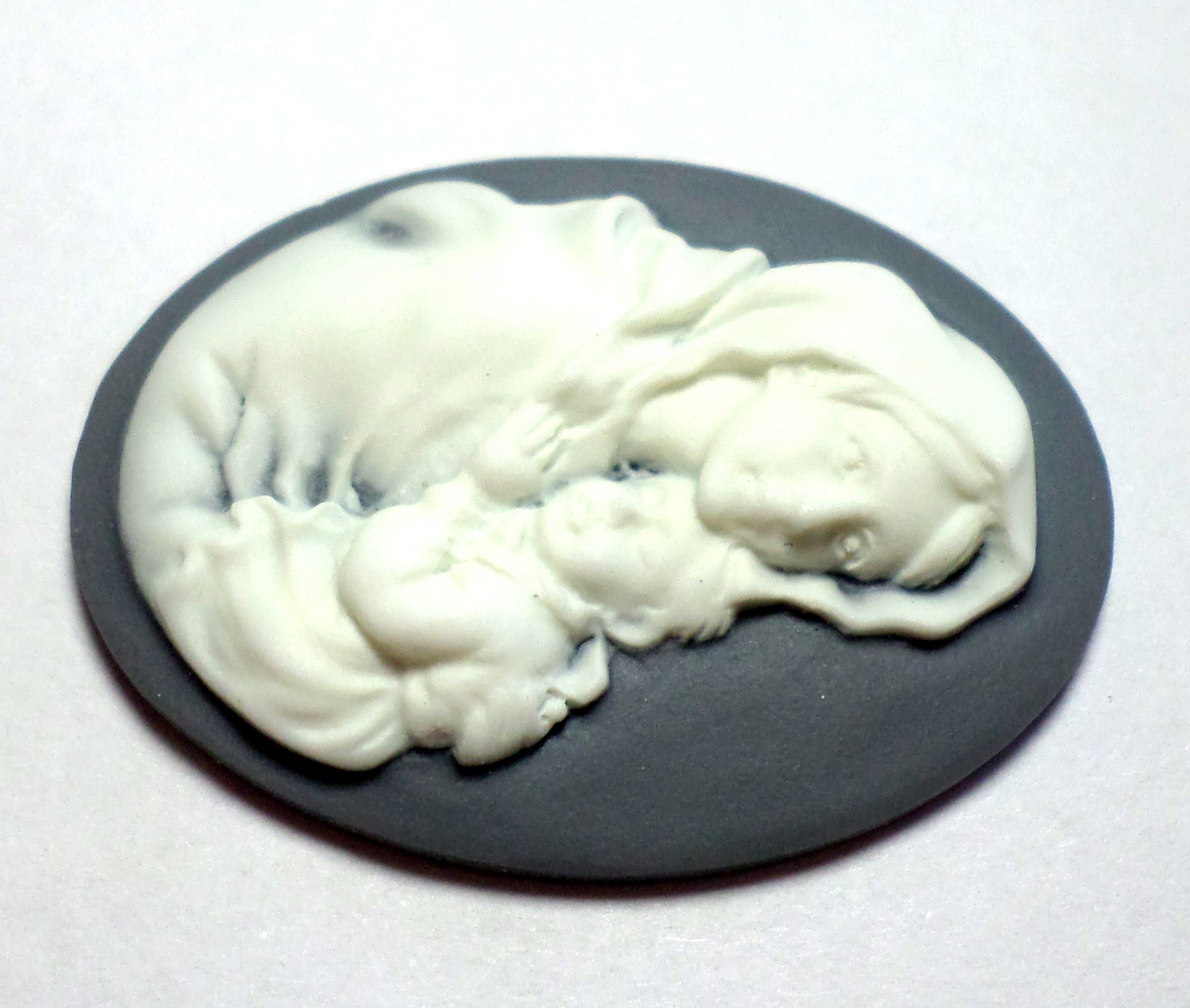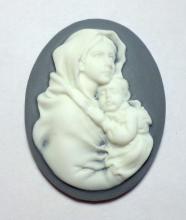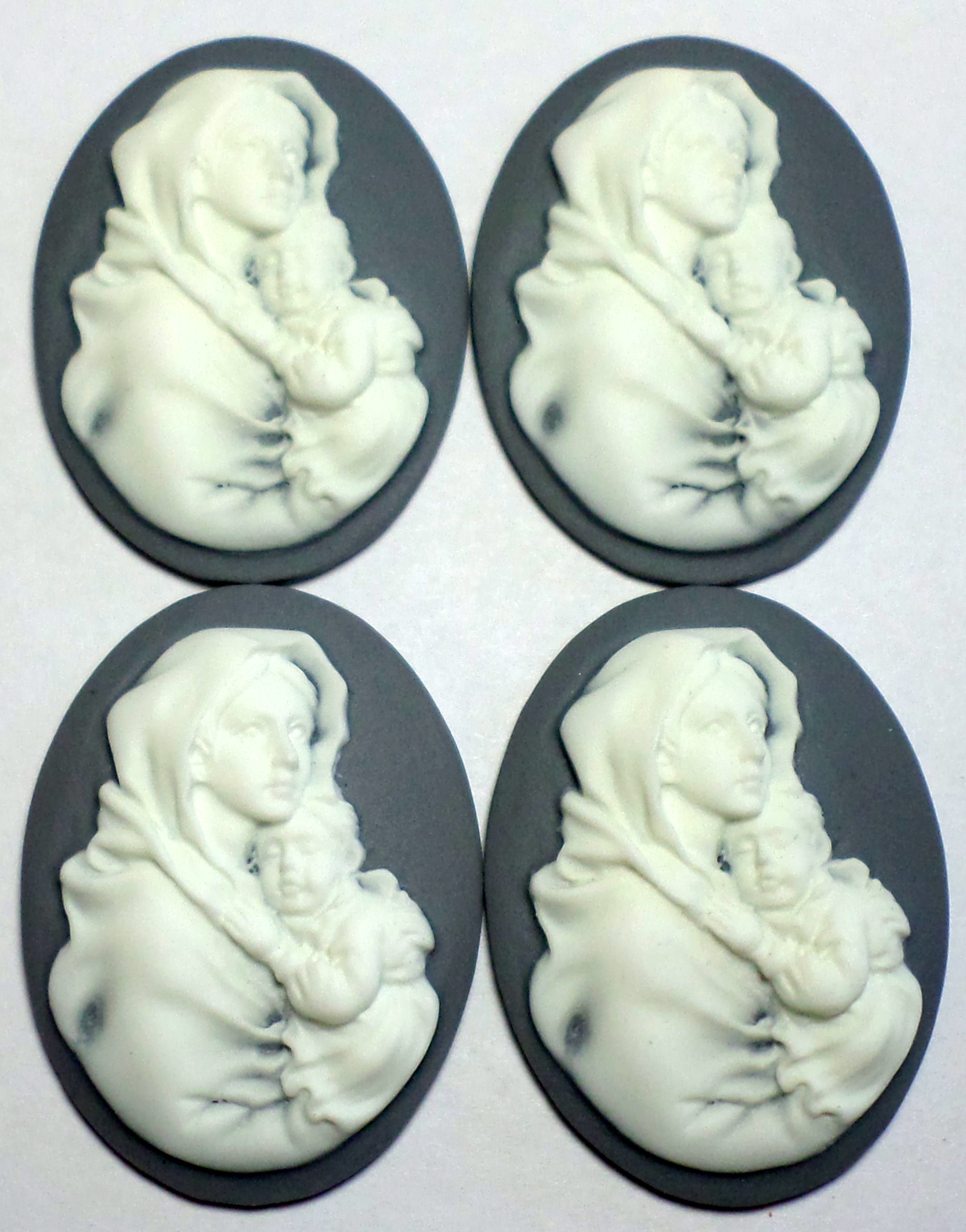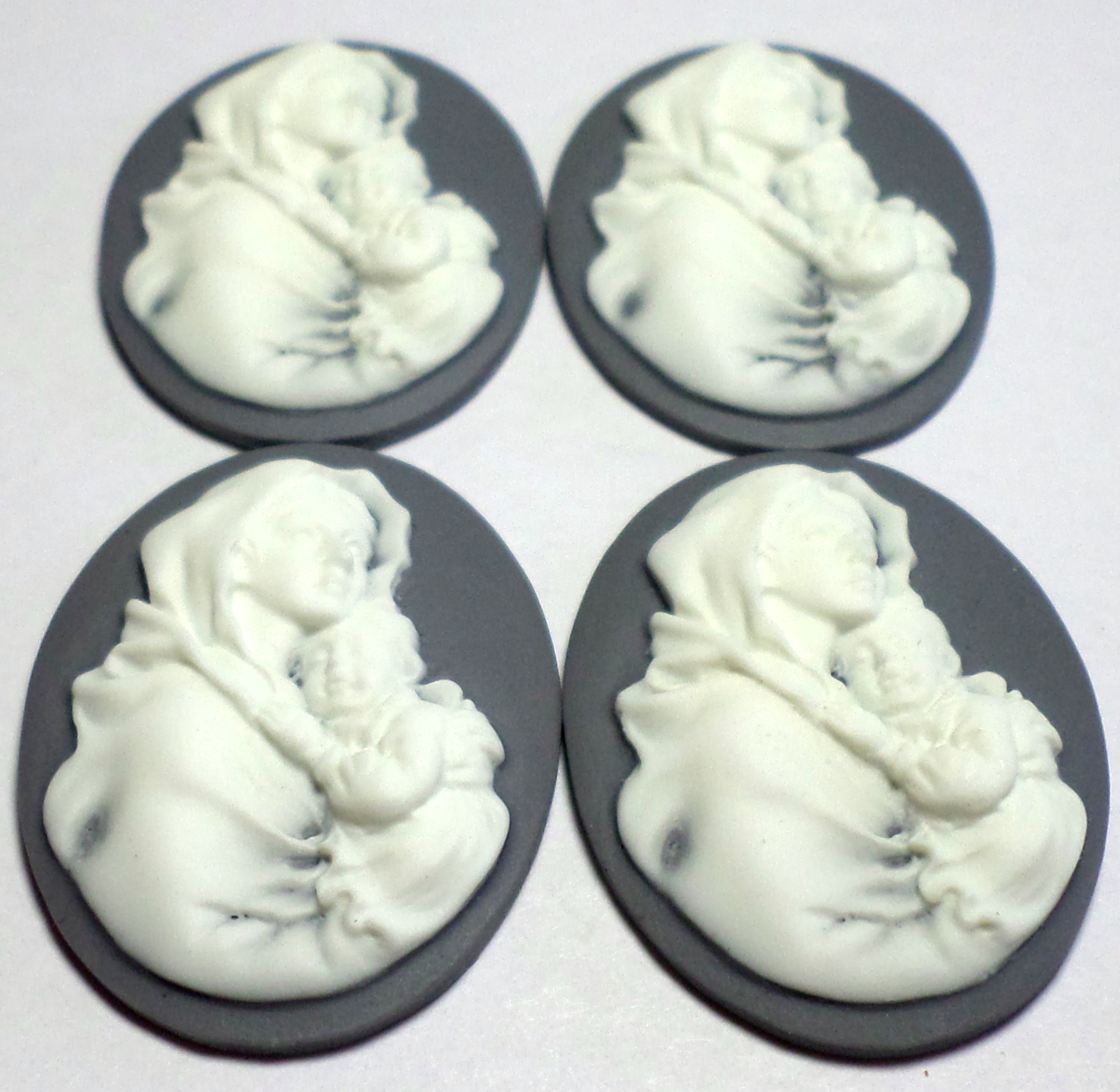 You are buying 4 of 40 mm x 30 mm White over Blue/Gray Virgin Mary Cradling Baby Jesus Cameos. They are of the Beautiful Virgin Mary with baby Jesus, held tight to her shoulder, these are molded. These stand out from the cameo to give them the 3-d effect. They are a White over a blue/gray background. These are simply gorgeous and show Mary cradling her Jesus. They look very detailed for their size. I have lots of Great Bails, Bracelets, Cameos, Chains, Connectors, Jump Rings, Lockets, Pendants, Pins, Rings & Settings so, just look at all my listings. I have these in 1 other Color (white over blue) item #111219176370 as shown in the next to last picture, sold separately, and in a group of 10 Colors as shown in the last picture item #111126962531, sold separately. I have more of this style in 40x30 mm & in 25x18 mm.