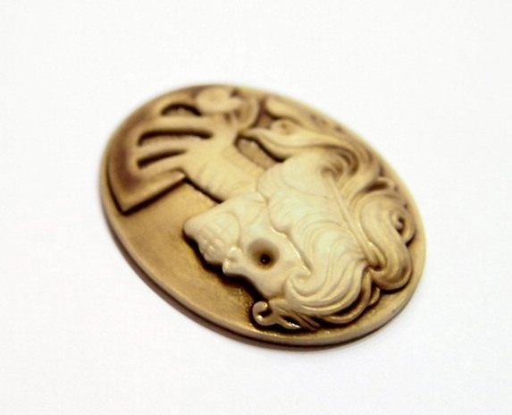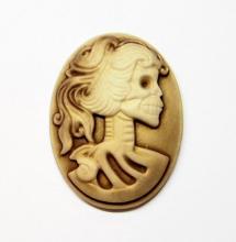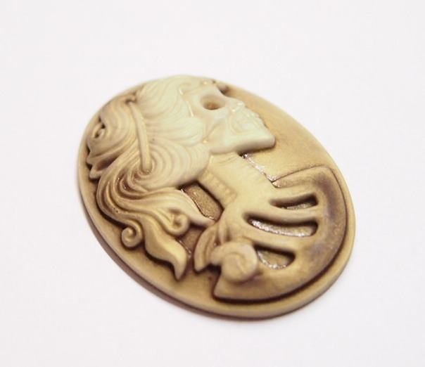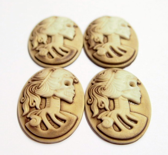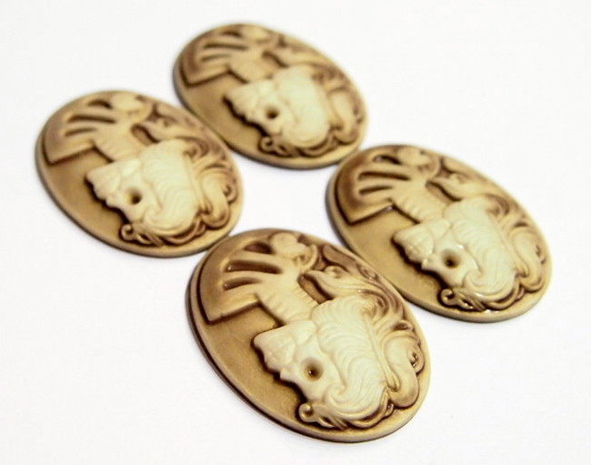 You are buying 4 of 40 mm x 30 mm White over Bronze Skeleton Zombie Queen Cameos. They are of a Lady Skeleton Zombie Queen, I think she is strange, but cool in a way. They are a White over Bronze Background. They measure 40 mm x 30 mm. They look very detailed for their size, in fact, they stand way out from the background to give it a 3-D look. They have never been used. I have lots of Great Bails, Bracelets, Cameos, Chains, Connectors, Jump Rings, Lockets, Pendants, Pins, Rings & Settings so, just look at all my listings. I have these in 7 other Colors & in a group of 8 Colors as shown in the next to last picture item #111608549279. I also have a group of 6 Colors in 25x18 mm as shown in the last picture item #360731980581.