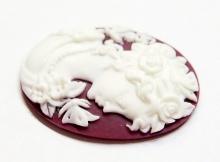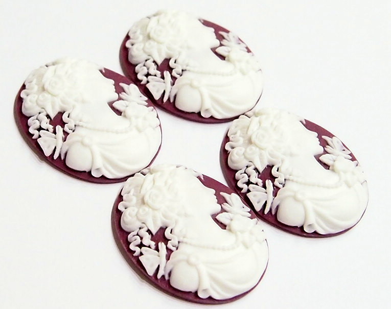 You are buying 4 of 40 mm x 30 mm White over Dark Plum Elegant Grecian Butterfly Woman Cameos. These are so gorgeous, this shows a beautiful Mythology Muse Or Grecian woman in a gown with her hair up and her hairband is all floral with roses and there are two butterflies, one on each side of her. She is wearing a pearl necklace and her gown has a floral accent too, they are perfect. The woman is white on a Dark Plum color background. The molding process of these are just great, no flaws. I have several different settings these will fit in. These are pretty fabulous. They look very detailed for their size. I have lots of Great Bails, Bracelets, Cameos, Chains, Connectors, Jump Rings, Lockets, Pendants, Pins, Rings & Settings so, just look at all my listings. I have these in 1 other Color & these are offered in a group of 10 Colors as shown in the last picture item #111589921829, sold separately.
