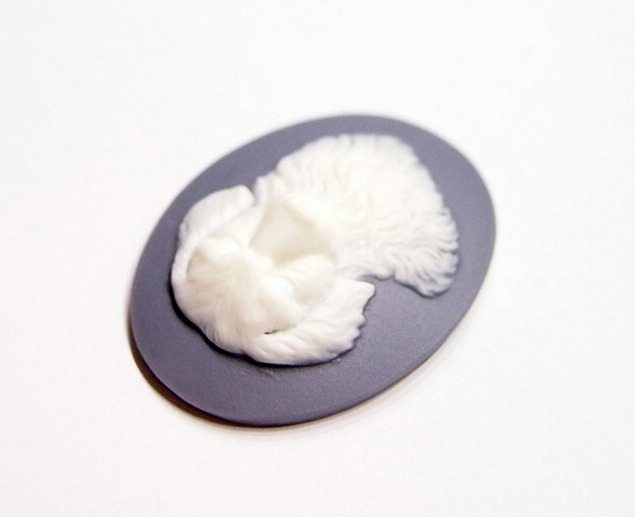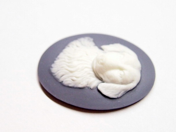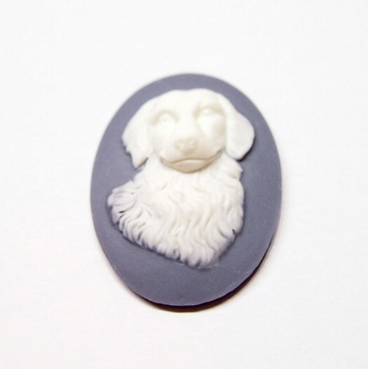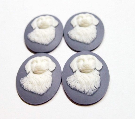 You are buying 4 of 40 mm x 30 mm White over Gray Blue Your Dog Cameos. These are just too cute, this shows a gorgeous depiction of maybe your Dog in a White color on a background of Grayish Blue. His or Her nose is facing Front, I also have another one where the Dog is facing toward the Left with the tongue out. All my cameos have never been used. The molding process of these are just great, no flaws. I have lots of different settings these will fit in. These are pretty fabulous. They measure 40 mm x 30 mm. They look very detailed for their size. I have lots of Great Bails, Bracelets, Cameos, Chains, Connectors, Jump Rings, Lockets, Pendants, Pins, Rings & Settings so, just look at all my listings. These are also offered in a group of 6 different 40x30 mm dog cameos as shown in the last picture item #362081808631 and are sold separately. I have lots of other animal cameos in several sizes, colors and styles.