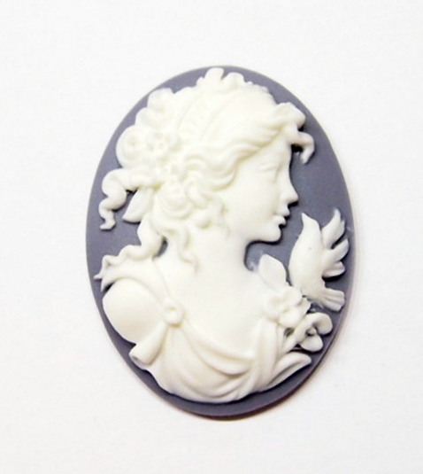You are buying 4 of 40 mm x 30 mm White over Gray Blue Grecian/Muse Woman with Bird Cameos. These are so gorgeous, this shows a beautiful Mythology Muse or Grecian woman in a beautiful gown with a headband in her hair & bird in front of her, they are perfect. The woman is white on a Grayish Blue color background. They measure 40 mm x 30 mm. The molding process of these are just great, no flaws. I have several different settings these will fit in. These are pretty fabulous. They look very detailed for their size. I have lots of Great Bails, Bracelets, Cameos, Chains, Connectors, Jump Rings, Lockets, Pendants, Pins, Rings & Settings so, just look at all my listings. I have these in 5 other Colors & in a group of 6 Colors as shown in the next to last picture item #110911248601. These are also offered in a group of 10 different 40x30 cameos as shown in the last picture item #360471677811 and are sold separately. I also have several Colors of these in 25x18 mm.