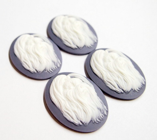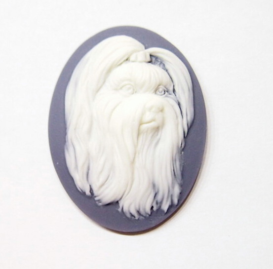 You are buying 4 of 40 mm x 30 mm White over Gray Blue Maltese or Shih Tzu Dog Cameos. These are just too cute, this shows a gorgeous long hair Maltese or Shih Tzu Dog in a White color on a background of Gray Blue. All my cameos have never been used. The molding process of these are just great, no flaws. I have several different settings these will fit in. These are pretty fabulous. They measure 40 mm x 30 mm. They look very detailed for their size. I have lots of Great Bails, Bracelets, Cameos, Chains, Connectors, Jump Rings, Lockets, Pendants, Pins, Rings & Settings so, just look at all my listings. These are also offered in a group of 6 different 40x30 mm dog cameos as shown in the last picture item #362081808631 and are sold separately. I have lots of other animal cameos in several sizes, colors and styles.