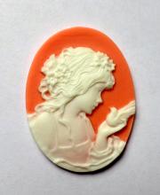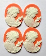 You are buying 4 of 40x30 mm Vintage White over Pink Classic Woman Holding a Bird Cameos. These are so gorgeous, they show a woman with floral in her hair holding out a hand for a bird to sit on. She is White on a Pink background. The molding process of these is just great, no flaws. These measure 40 mm x 30 mm. I have lots of different settings these will fit in. These are pretty fabulous. They look very detailed for their size. These are a lot flatter than most all of the other cameos this size that I have listed. I have had these for a very long time so I know these are older than most. I have lots of Great Bails, Bracelets, Cameos, Chains, Connectors, Jump Rings, Lockets, Pendants, Pins, Rings & Settings so, just look at all my listings. I have several other cameos in this size and in 25x18 mm with a woman and a bird. The next to last picture is a group of them in 40x30 mm item #110911248601, sold separately. The last picture is another group of cameos like this one with a woman and bird in 40x30 mm item #360946006408, sold separately.
