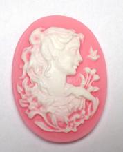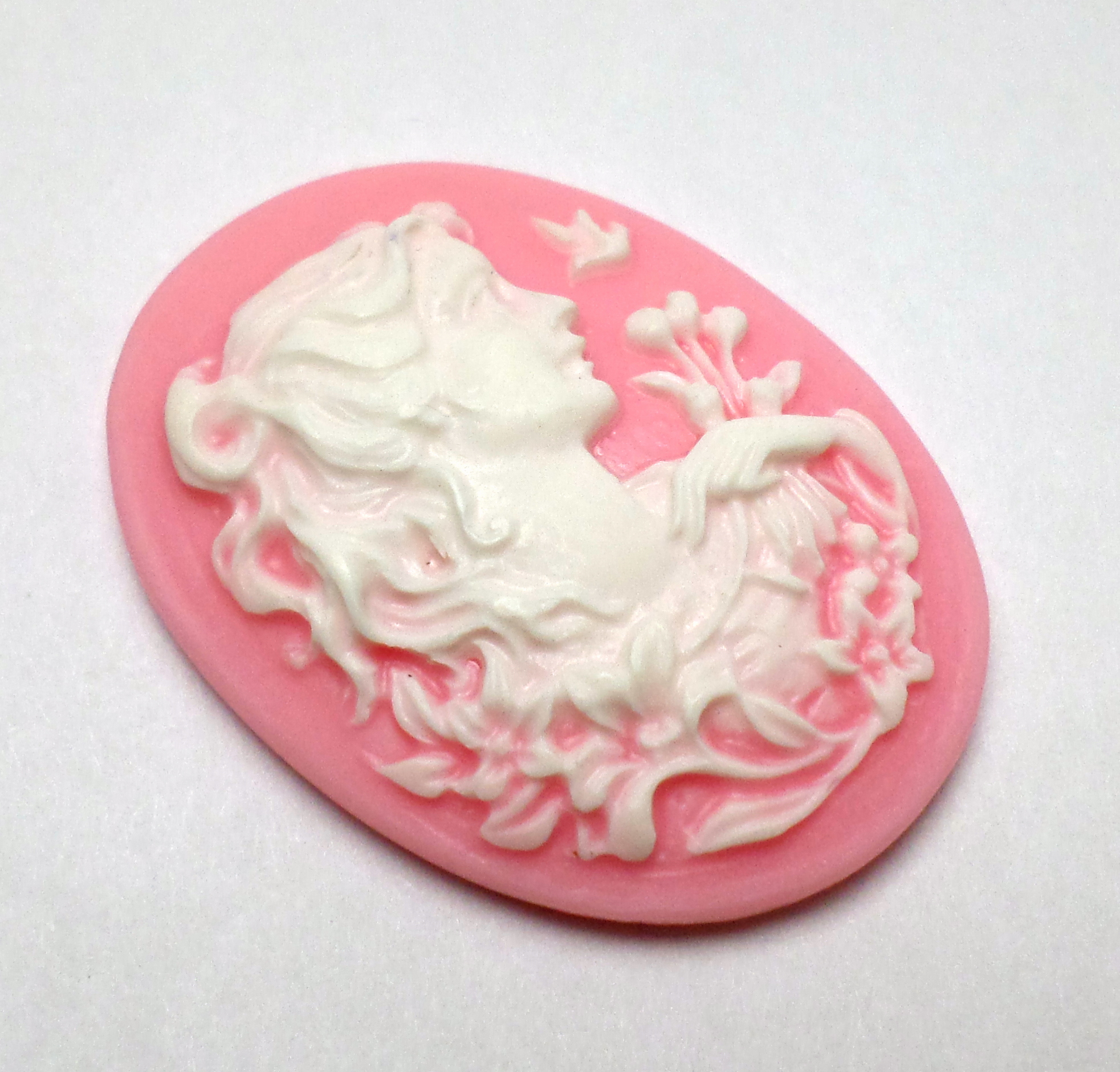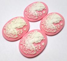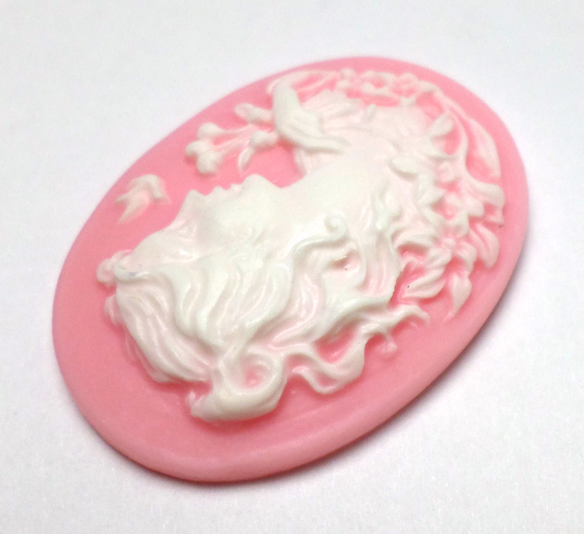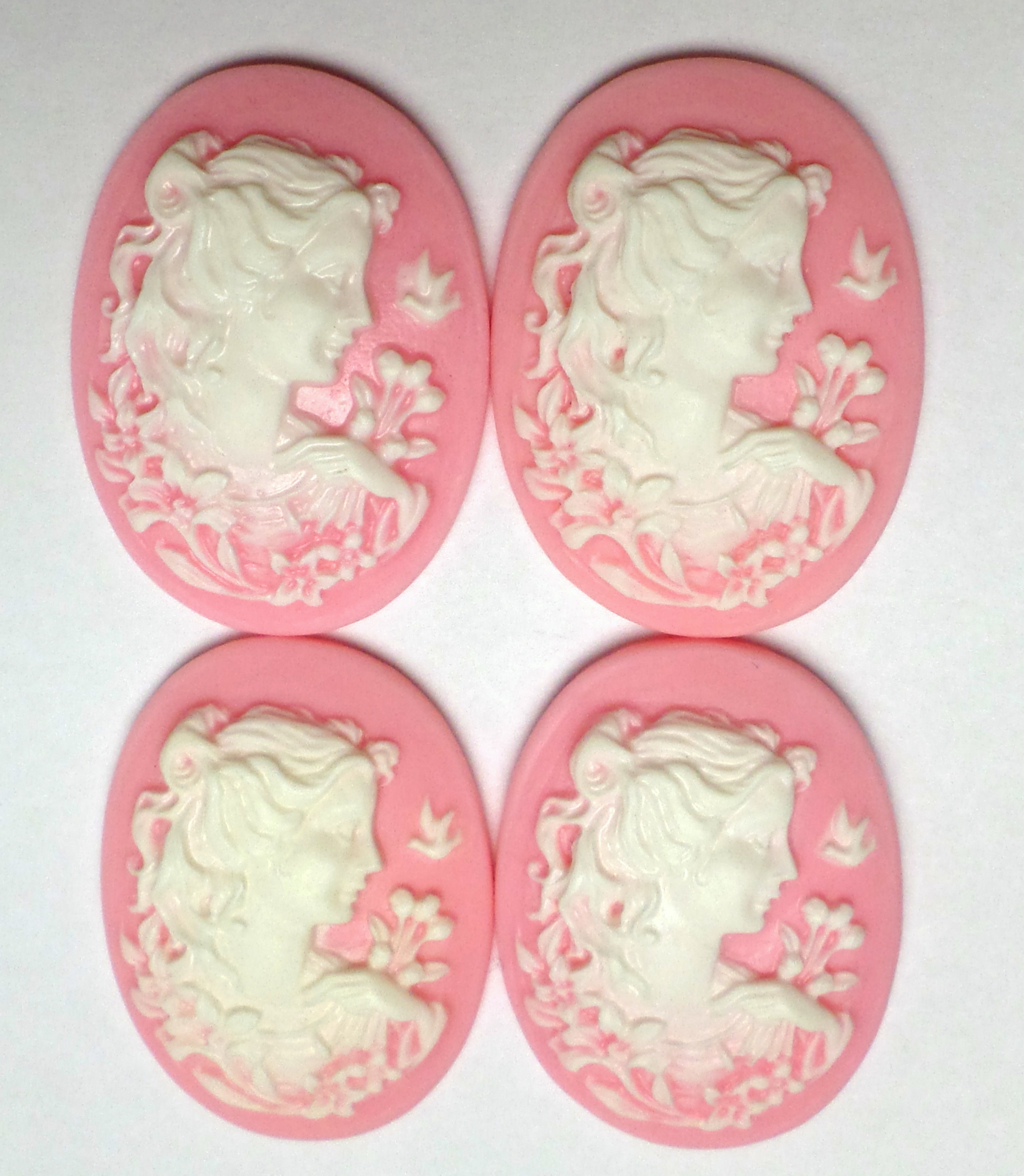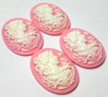You are buying 4 of 40 mm x 30 mm White over Pink Floral Ponytail Woman Cameos. These are so gorgeous, this shows a Gorgeous Victorian woman from the neck up surrounded by a floral pattern in a white color on a background of Pink. The molding process of these are just great, no flaws. I have several different settings these will fit in. They measure 40 mm x 30 mm. These are pretty fabulous. They look very detailed for their size. I have lots of Great Bails, Bracelets, Cameos, Chains, Connectors, Jump Rings, Lockets, Pendants, Pins, Rings & Settings so, just look at all my listings. These are also offered in a group of 10 Colors as shown in the next to last picture item #360600704578. I offer lots of other Cameos like this and in groups so give them all a look. I also have these in white over gray/black as shown in the last picture.