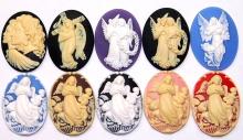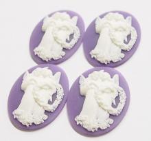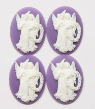 You are buying 4 of 40 mm x 30 mm White over Purple two Angels Holding a Heart Wreath Cameos. The details are very sharp and stand away from the background, giving it a 3-D effect. They are White in color, the background is purple. They look very detailed for their size. I have lots of Great Bails, Bracelets, Cameos, Chains, Connectors, Jump Rings, Lockets, Pendants, Pins, Rings & Settings so, just look at all my listings. I have these in 1 other Color & in a group of 10 Colors as shown in the next to last picture item #360601358717. Also offered is a group of 8 Colors in 40x30 mm Cherubs or Angels Playful Cameos as shown in the last picture item #360601351606.