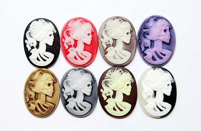 You are buying 4 of 40 mm x 30 mm White over Red Skeleton Lady Cameos. They are of a Lady Skeleton Zombie Queen, I think she is strange, but in a Cool way, the molding is very well done. They are White that fades into the off Red Background. They measure 40 mm x 30 mm. I have them in all sorts of colors, so check my other listings. They look very detailed for their size, in fact, they stand way out from the background to give it a 3-D look. They have never been used. I have lots of Great Bails, Bracelets, Cameos, Chains, Connectors, Jump Rings, Lockets, Pendants, Pins, Rings & Settings so, just look at all my listings. I have these in 7 other Colors & in a group of 8 Colors as shown in the last picture. I also have these in 25x18 mm in several Colors.
