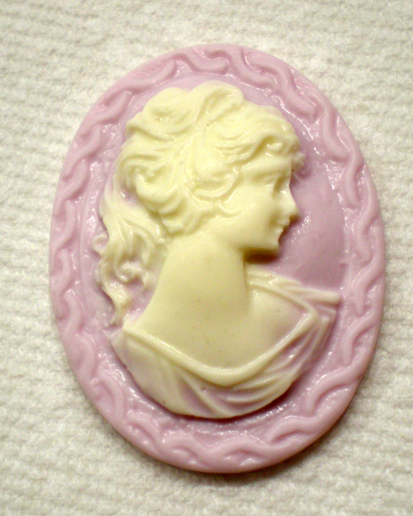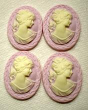 You are buying 4 Vintage Molded Resin Cameos. These are so gorgeous, this shows a beautiful Victorian Woman with a ponytail, these are thicker in the middle, as shows their age is older, but they are perfect. The Victorian Lady is a Cream on a gorgeous Lavender color lacy background. The molding process of these are just great, no flaws. These are pretty fabulous. They measure 41 mm x 32 mm. They look very detailed for their size. I have lots of great cameos, settings, connectors and pendants so, just look at all my listings.