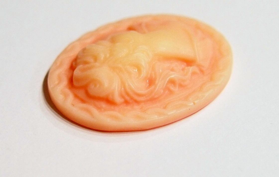 You are buying 4 Vintage Molded Resin Cameos. These are so gorgeous, this shows a beautiful Victorian Woman with a ponytail, these are thicker in the middle, as shows their age is older, but they are perfect. The Victorian Lady is Light Peach on a gorgeous Peach background. I have several different colors of these, so check my other listing to see them, they are really gorgeous. The molding process of these are just great, no flaws. I have several different settings these will fit in. These are pretty fabulous. They measure 41 mm x 32 mm. You will need to nail file these down to get them to fit into a 40 mm x 30 mm pendant, or just glue a bail on them, either way they are very nice. They look very detailed for their size. I have lots of great cameos, settings, connectors and pendants so, just look at all my listings.