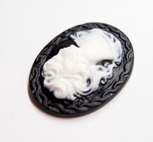 You are buying 4 of 42 mm x 32 mm White over Black Ponytail Lady & Lace Edges Cameos. These are so gorgeous, this shows a beautiful Victorian Woman with a ponytail. These have a lacey pattern all around the outside which really shows off. The Victorian Lady is White on a Black lacy background. I have several different colors of these, so check my other listing to see them, they are really gorgeous. The molding process of these are just great, no flaws. I have several different settings these will fit in. These are pretty fabulous. They measure 42 mm x 32 mm. They look very detailed for their size. I have lots of Great Bails, Bracelets, Cameos, Chains, Connectors, Jump Rings, Lockets, Pendants, Pins, Rings & Settings so, just look at all my listings. I also have these in a cream over Pink.