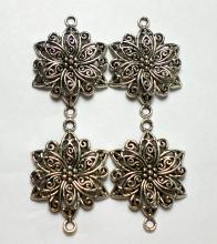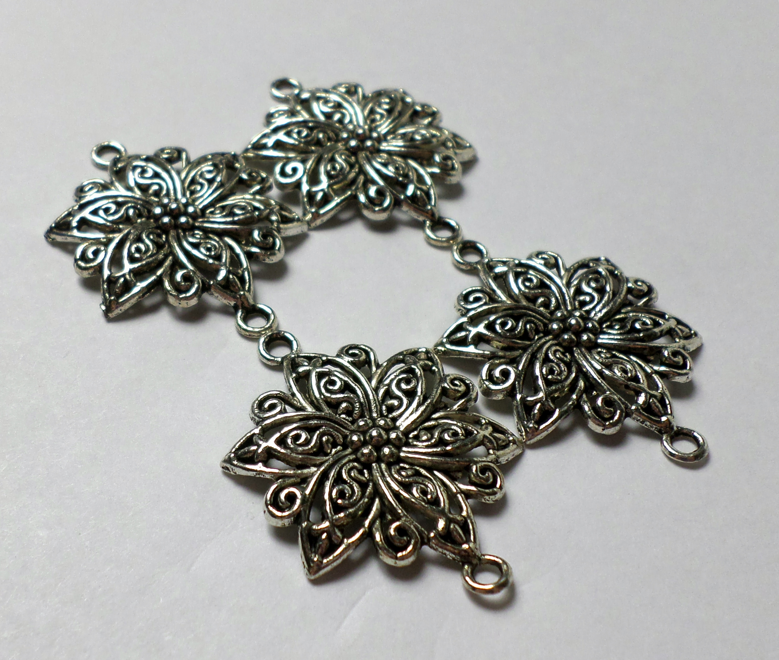 You are buying 4 of Antique Silver Plated 6 Point Double Loop Flower Connectors. These measure 40 mm x 28 mm including the loops at each end. The top & bottom have a nice size loop (2.8 mm) for your Chain or Cord or Jump Ring (which I have 3 Colors & 2 Sizes of). These are very ornate & intricate. These can be used by themselves or as connectors to make your piece even more stunning. These will help you start or finish any project you have. I have lots of Great Bails, Bracelets, Cameos, Chains, Connectors, Jump Rings, Lockets, Pendants, Pins, Rings & Settings so, just look at all my listings. These are also offered in a group of 4 colors as shown in the last picture item #111889551679, sold separately. These are also included in a group of 20 different antique silver plated connectors as shown in the last picture item #360942863935, sold separately.