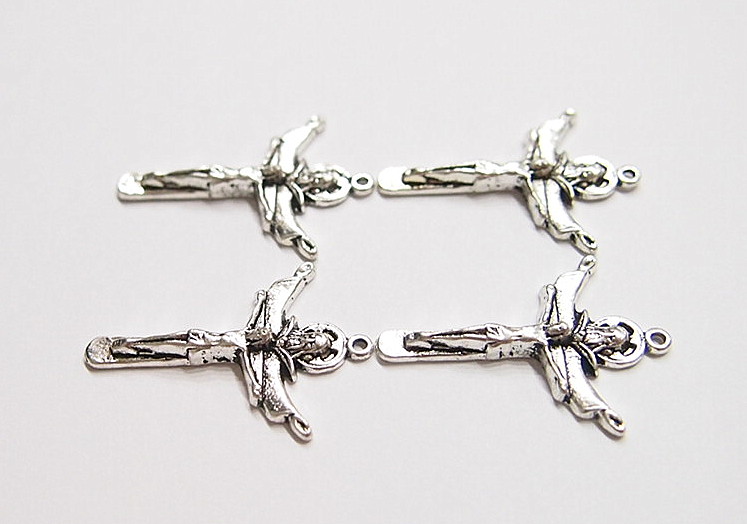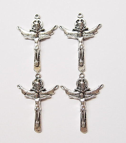 You are buying 4 Antique Silver Plated Jesus on the Cross with God behind pendants. These are very detailed & will make great gifts for anyone. These measure 34 mm x 24 mm including the loop at the top. The top has a nice size loop (2 mm) for your Chain or Cord or Jump Ring (which I have 3 Colors & 2 Sizes of). These are lightweight & sturdy. You could use these as earrings or charms. I have lots of Great Bails, Bracelets, Cameos, Chains, Connectors, Jump Rings, Lockets, Pendants, Pins, Rings & Settings so, just look at all my listings. I have these in 2 other Colors (Antique Gold & Bright Silver) & in a group of 3 Colors as shown in the last 2 pictures item #360958546644. I have several other plated pendants in lots of Colors & sizes.