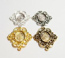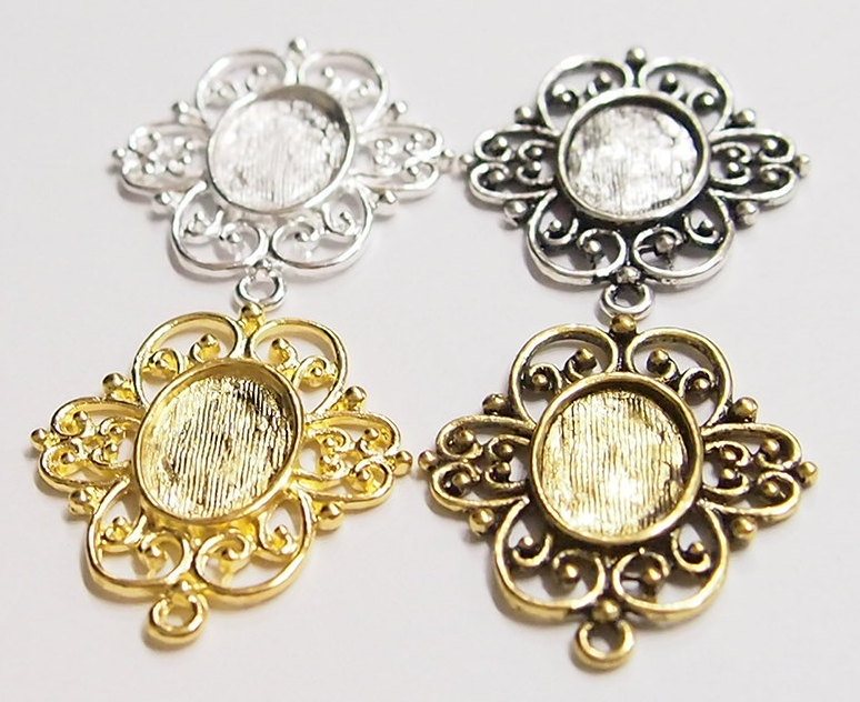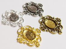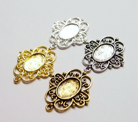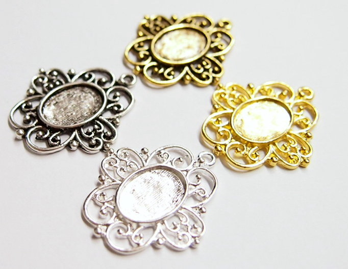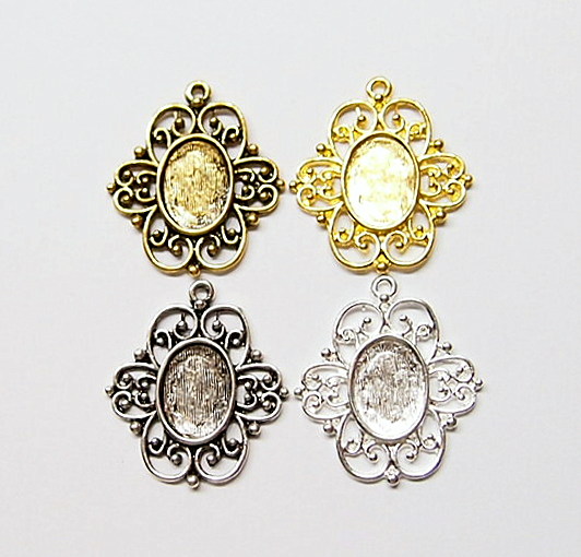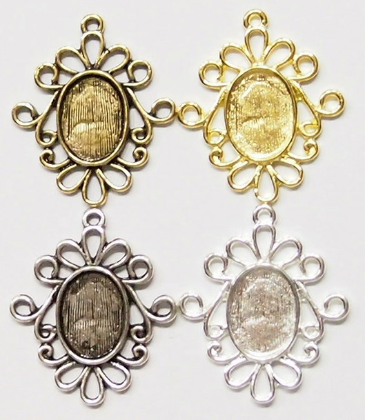 You are buying 4 different Colors of 14 mm x 10 mm Flower Design Pendant or Earring Settings. You will receive one each Antique Gold, Gold, Antique Silver & Silver, these are all Plated. These settings are originally from the 1900-1930's, I only had a few left and found a company to make these for me and they are gorgeous. These are beautiful settings, the pattern is a flowery design and is going to accent any cameos or cabochons you put in them. You will have to glue in any cameos, cabochons, glass, or whatever you want. These have never been used and are all new. Since they are a solid back, you could go down in size a little if you had an odd size cameo or cabochon to try and fit. You will not be disappointed in the quality, it is excellent and if I was setting any cameos or cabochons, I would use these. I have lots of Great Bails, Bracelets, Cameos, Chains, Connectors, Jump Rings, Lockets, Pendants, Pins, Rings & Settings so, just look at all my listings. These are all offered in groups of 6 of each Color. The Antique Gold is item #360478420793, Shiny Gold is item #110930805582, Antique Silver is item #110930805527, and the Shiny Silver is item #110930807367. I also have settings without as much of a flowery ornate in between the pedals in 4 Colors as shown in the next to last picture item #161924773928, sold separately. These are also offered in a group of 29 Different 14x10 Settings in all Colors as shown in the last picture Item #110911244707, sold separately.