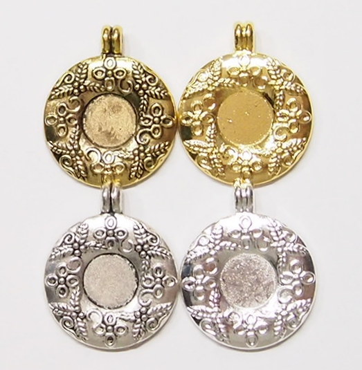 You are buying 4 Colors of 15 mm Round Floral Pendant Settings. You will receive one each Antique Gold, Gold, Antique Silver & Silver, these are all Plated. These fit 15 mm cabs or cameos or coins. These have a nice Floral pattern made into the outside of them. Since they are a solid back, you could go down in size a little if you had an odd size cameo or cab to try & fit. The outside measures 36 mm in diameter. The top has a nice size loop (4 mm) for your Chain or Cord or Jump Ring (which I have 3 Colors & 2 Sizes of). Cabs or Cameos will have to be glued in, no prongs. I have lots of Great Bails, Bracelets, Cameos, Chains, Connectors, Jump Rings, Lockets, Pendants, Pins, Rings & Settings so, just look at all my listings. All of these are offered in groups of 4 of each color. The antique gold is item #110930805507, gold is item #360471675963, antique silver is item # 110911244720, and the silver is item # 110911243377. I have several other round settings in lots of Colors & Styles.