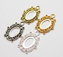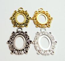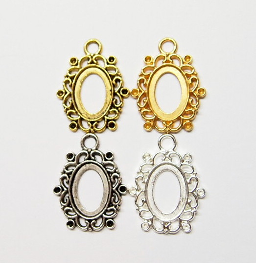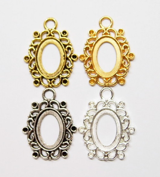 You are buying 4 different Colors of 18 mm x 13 mm Old Style Floral Pendant Settings. You will receive one each Antique Gold, Gold, Antique Silver & Silver, these are all Plated. On the 6 points there are places where you can put rhinestones or crystals, but these look fine without adding anything. These settings are originally from the 1900-1930's, I only had a few left and found a company to make these for me and they are gorgeous. The design is just delicate, but they are very solid, not flimsy like the new ones are. You will not be disappointed in the quality, it is excellent and if I was setting any cameos or cabochons, I would use these. These will work great for any cameos or cabs, they will have to be glued in. I have lots of Great Bails, Bracelets, Cameos, Chains, Connectors, Jump Rings, Lockets, Pendants, Pins, Rings & Settings so, just look at all my listings. These are all offered in groups of 6 of each Color and are sold separately. The Antique Gold is item #110930805495, Shiny Gold is item #110911243351, Antique Silver is item #110930805548, and the Shiny Silver is item #110911243367. I have several other styles of 18x13 mm pendants and rings.
