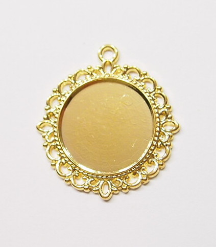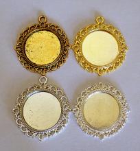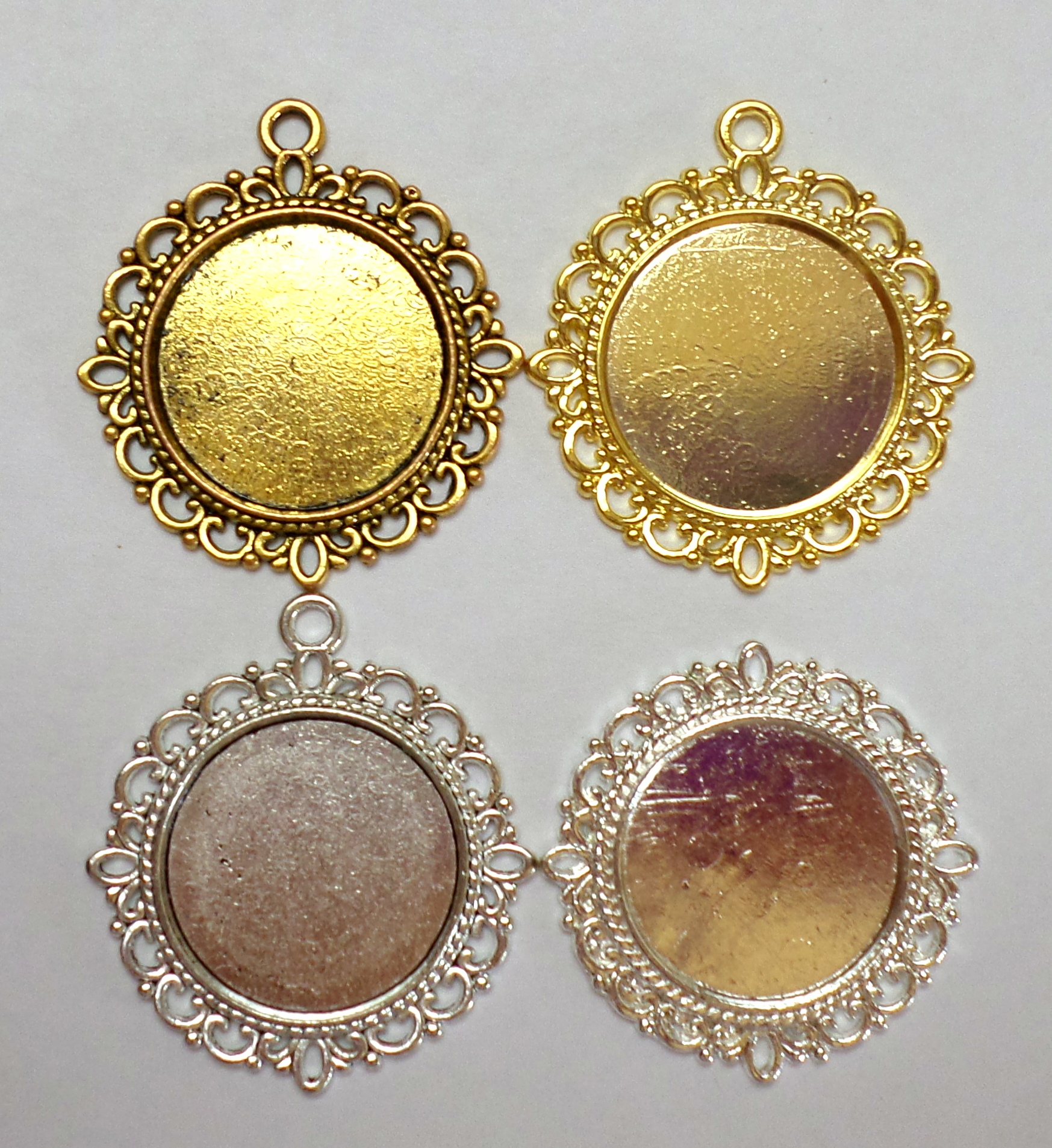 You are buying 4 different Colors of 20 mm Round 4 Loops Pendant Settings. You will receive 1 antique gold, 1 shiny gold, 1 antique silver, and one shiny silver. These are all plated. These are very well made and sturdy. You will not be disappointed in the quality, it is excellent and if I was setting any cameos, cabochons, or glass, I would use these. The outside measures 30 mm in diameter. The top has a nice size loop (2.6 mm) for your Chain or Cord or Jump Ring (which I have 3 Colors & 2 Sizes of). Since they are a solid back, you could go down in size a little if you had an odd size cameo or cab to try & fit. These are lightweight & sturdy. The backs of these have a basket weave pattern (except for the silver). I have lots of Great Bails, Bracelets, Cameos, Chains, Connectors, Jump Rings, Lockets, Pendants, Pins, Rings & Settings so, just look at all my listings. These are all offered in groups of 6 of each Color. The antique gold is item #111107367576, the shiny gold is item #360471677829, antique silver is item #360684986688 and the shiny silver without a bail is item #360471675953. I have several other round settings in lots of styles & Colors.