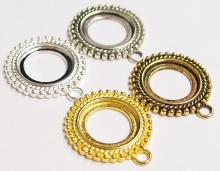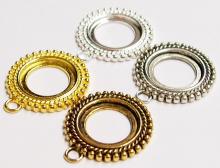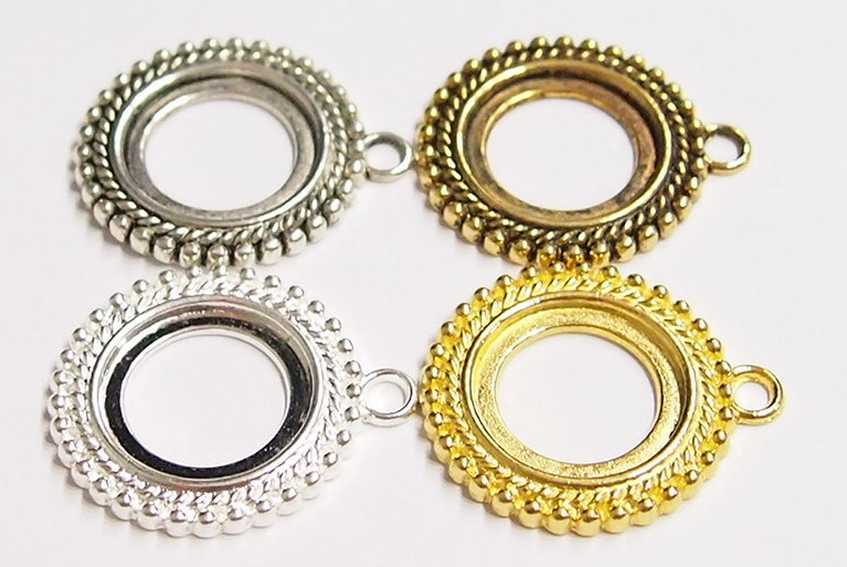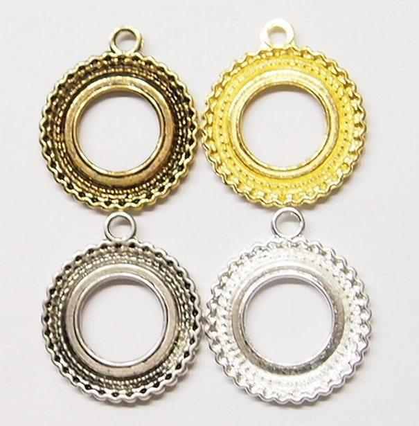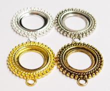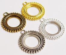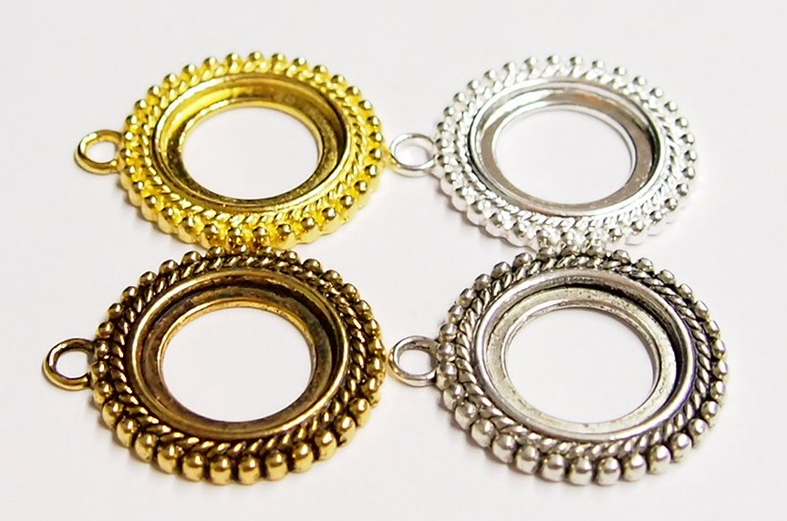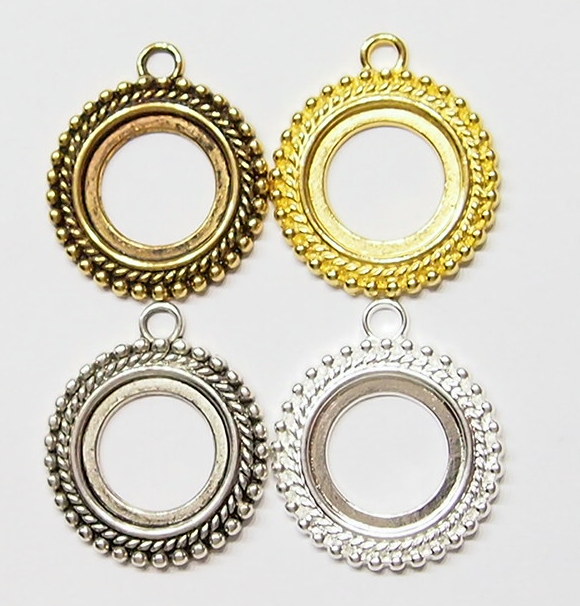 You are buying 4 different Colors of 20 mm Round Beaded & Rope Pattern Pendant Settings. These pendants have a Gorgeous Beaded outer pattern & a twisted Rope inner pattern. You will not be disappointed in the quality, it is excellent and if I was setting any cameos or cabochons, I would use these. These are lightweight & sturdy. The setting measures 20 mm & the outer diameter is 30 mm. The top has a nice size loop (3.8 mm) for your Chain or Cord or Jump Ring (which I have 3 Colors & 2 Sizes of). Cameos or Cabochons will have to be glued in, no prongs. I have lots of Great Bails, Bracelets, Cameos, Chains, Connectors, Jump Rings, Lockets, Pendants, Pins, Rings & Settings so, just look at all my listings. All of these are offered in groups of 6 of each Color. The antique gold is item #111661853817, gold is item #111662839148, antique silver is item #360521235110, and the shiny silver is item #360471675599, all are sold separately.
