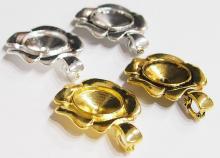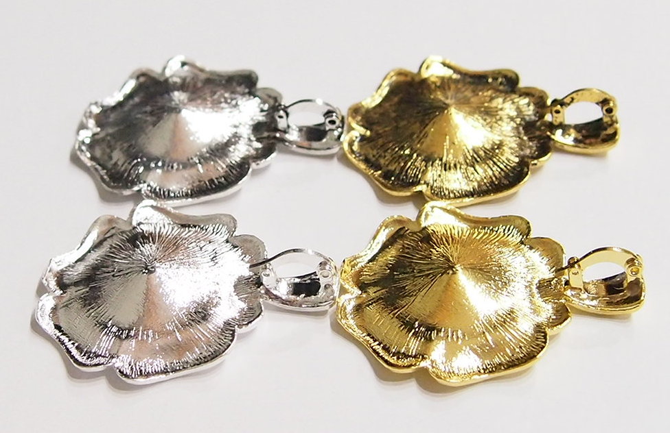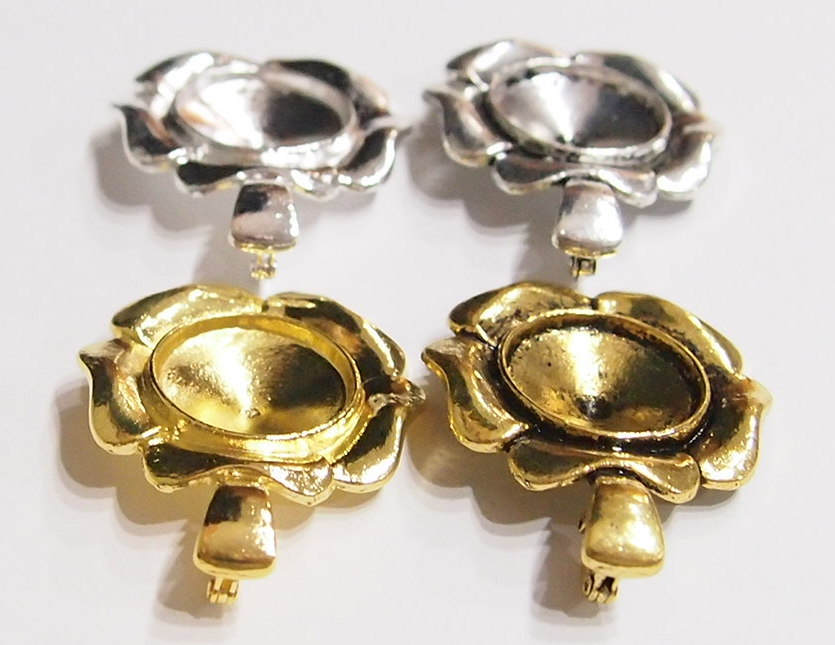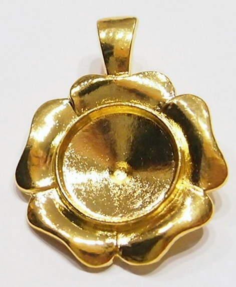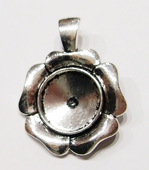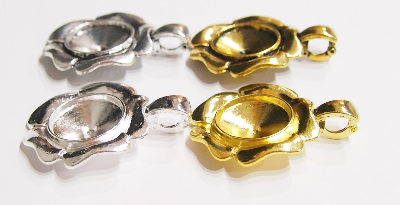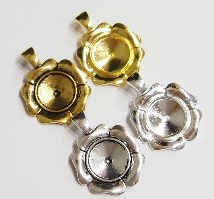 You are buying 4 different Colors of 20 mm Round Flower Shaped with Enhancer Bail Pendant Settings. These are very nice. You will receive one each Antique Gold, Gold, Antique Silver & Silver, these are all Plated. They fit 20 mm cameos or cabochons, but because of the inside, you can put a smaller cameo or cab, they will fit great in these settings. These are in the shape of a flower and they have the bonus Enhancer Bail, so you can put these over an existing necklace. They are great quality, I had these made. Cameos or cabs will have to be glued in, no prongs. I have lots of Great Bails, Bracelets, Cameos, Chains, Connectors, Jump Rings, Lockets, Pendants, Pins, Rings & Settings so, just look at all my listings. All of these are all offered in groups of 4 of each colors. The antique gold is item #110911248584, shiny gold item #360471677886, antique silver item #181559832715, and the shiny silver is item #110911248650. I have a Rose pattern pendant like these except the center has the Rose pedals in the center with lots of great detail.
