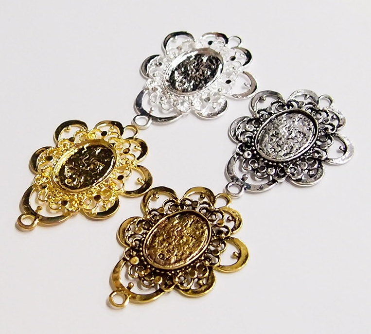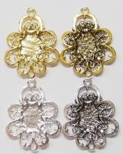 You are buying 4 Colors of 24 mm x 18 mm Old Style Flower Pendant Settings. You will receive one each Antique Gold, Gold, Antique Silver & Silver, these are all Plated. The setting on these measures 24 mm x 17.7 mm. What I do is take a nail file and round off the bottom and top & a little off the sides to make it fit perfectly into the settings, then a little adhesive and its done. The outside measures 56 x 44 mm including the loop at the top. The top has a nice size loop (4.1 mm) for your Chain or Cord or Jump Ring (which I have 3 Colors & 2 Sizes of). These settings are originally from the 1900-1930's, I only had a few left and found a company to make these for me and they are gorgeous. The design is just delicate, but they are very solid, not flimsy like the new ones are. You will not be disappointed in the quality, it is excellent and if I was setting any cameos or cabochons, I would use these. Since they are a solid back, you could go down in size a little if you had an odd size cameo or cab to try & fit. These will work great for any cameos or cabs, they will have to be glued in. I have lots of Great Bails, Bracelets, Cameos, Chains, Connectors, Jump Rings, Lockets, Pendants, Pins, Rings & Settings so, just look at all my listings. All of these are offered in groups of 4 of each color. The antique gold is item #360471677817, shiny gold item #361122922675, antique silver item #360471676005, and the silver is item #110911243375.