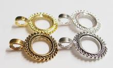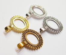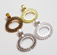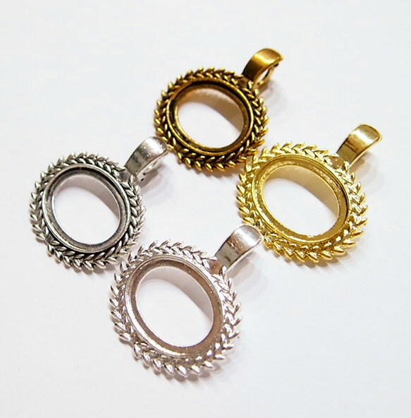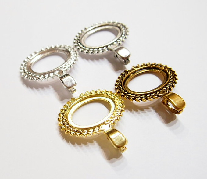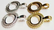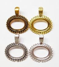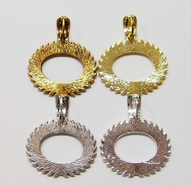 You are buying 4 different Colors of 25 mm x 18 mm Horizontal Wreath Design Pendant Settings, with an Enhancer Bail. You will receive one each Antique Gold, Gold, Antique Silver & Silver, these are all Plated. These settings are originally from the 1900-1930's, I only had a few left and found a company to make these for me and they are gorgeous. The Enhancer bail comes open so you can place it on any necklace or cord you want and close it back into place, they are called enhancers. This works great if you have a necklace that you want to have a focal point to make the whole necklace more spectacular. I have several other size & shapes of pendants that have this same enhancer bail feature. These pendants look like a wreath or razor edge design, they are not sharp, these are solid, sturdy and well made pendant settings. Everything is solidly made from the setting to the enhancer bail. I have lots of Great Bails, Bracelets, Cameos, Chains, Connectors, Jump Rings, Lockets, Pendants, Pins, Rings & Settings so, just look at all my listings. These are all offered in groups of 4 of each Color. The Antique Gold is item #110911248598, Shiny Gold is item #360471676515, Antique Silver is item #111044125832, and the Shiny Silver is item #110911243372, and are all sold separately.