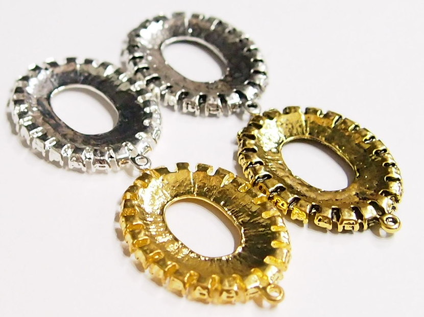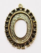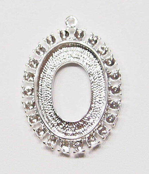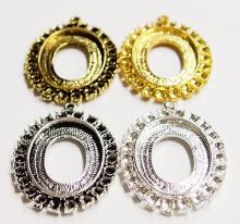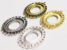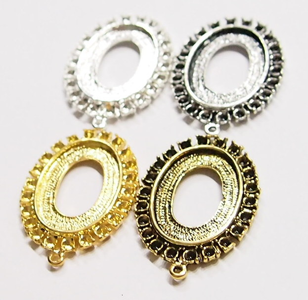 You are buying 4 Colors of 25 mm x 18 mm Old Style with places for Crystals or Stones Pendant Settings. You will receive one each Antique Gold, Gold, Antique Silver & Silver, these are all Plated. These settings are originally from the 1900-1930's, I only had a few left and found a company to make these for me & they are gorgeous. The design is just delicate, but they are very solid, not flimsy like the new ones are. The outside measures 37x27 mm including the loop at the top. The top has a nice size loop ( 2 mm) for your Chain or Jump Ring (which I have 3 Colors & 2 Sizes of). These have places for crystals or stones (22) all around the entire setting that measure 2.2 mm. You will not be disappointed in the quality, it is excellent and if I was setting any cameos or cabs, I would use these. These will work great for any cameos or cabs, they will have to be glued in. I have lots of Great Bails, Bracelets, Cameos, Chains, Connectors, Jump Rings, Lockets, Pendants, Pins, Rings & Settings so, just look at all my listings. All of these are offered in groups of 4 of each color. The antique gold is item #111864003054, gold is item #110911244761, antique silver is item #110911243378, and the silver is item #360471676434.