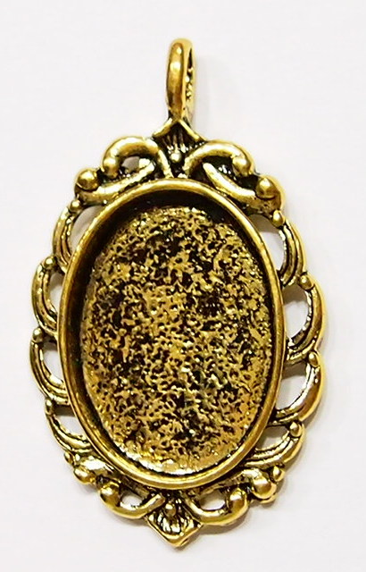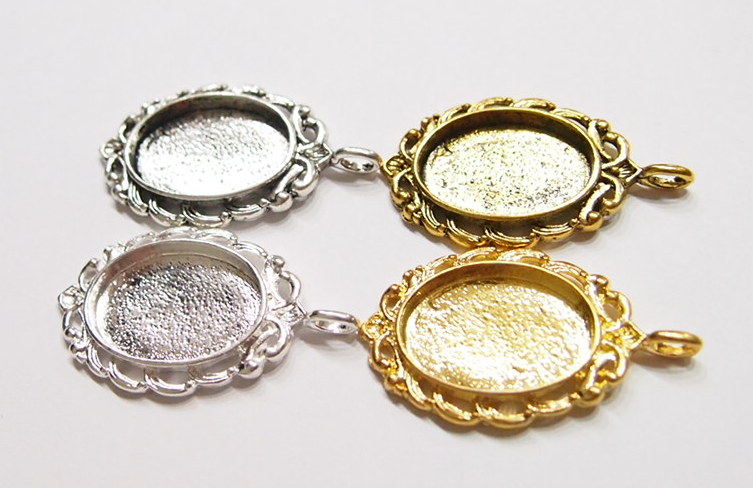 You are buying 4 Colors of 25 mm x 18 mm Oval Scalloped Edged Pendant Settings. You will receive one each Antique Gold, Gold, Antique Silver & Silver, these are all Plated. They have a scalloped open frame shape around the setting. The outer dimensions are 46 x 27 mm including the loop at the top. The top has a nice size loop (5 x 2.7 mm) for your Chain or Cord or Jump Ring (which I have 3 Colors & 2 Sizes of). These have never been used. These are exactly made for 25 mm x 18 mm. Since they are a solid back, you could go down in size a little if you had an odd size cameo or cab to try & fit. You will not be disappointed in the quality, it is excellent and if I was setting any cameos, cabochons, glass, or whatever you want,I would use these. These are lightweight & sturdy. They have a gorgeous Victorian look to them. I have lots of Great Bails, Bracelets, Cameos, Chains, Connectors, Jump Rings, Lockets, Pendants, Pins, Rings & Settings so, just look at all my listings. All of these are offered in groups of 4 of each Color. The antique gold is item #110930805560, gold is item #360478420845, antique silver is item # 110930805483, and the silver is item #110930805436.