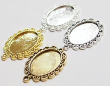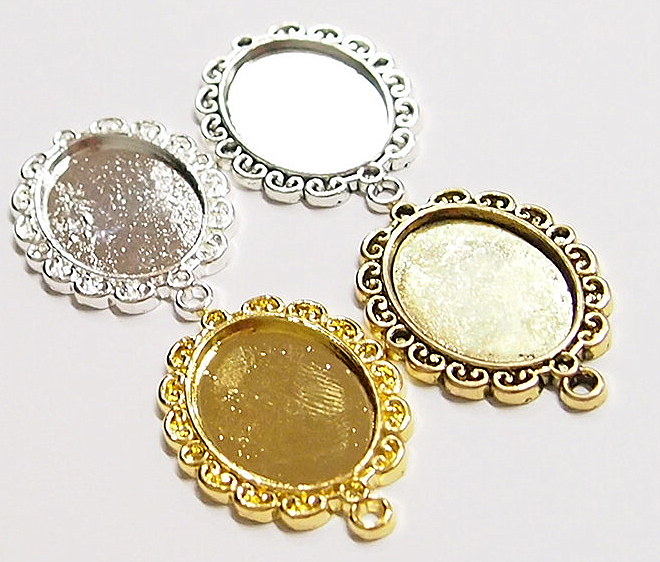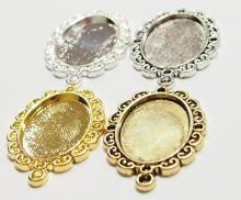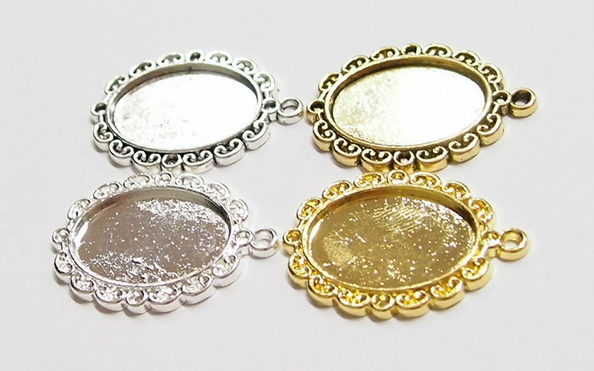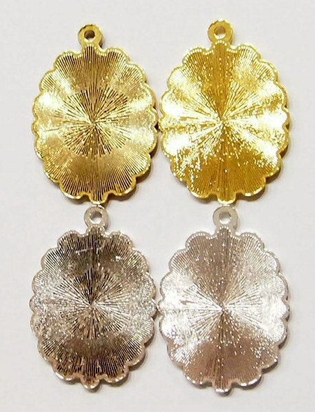 You are buying 4 Colors of 25 mm x 18 mm Oval Scalloped Flower Design Pendant Settings. You will receive one each Antique Gold, Gold, Antique Silver & Silver, these are all Plated. They have a scalloped Flowered Design around the edge of the pendant setting. The top has a nice size loop (2.6 mm) for your Chain or Cord or Jump Ring (which I have 3 Colors & 2 Sizes of). These are Glue in settings and are very sturdy. There is a place to add a small crystals at the top & bottom or just leave them blank, as they look just fine the way they are. These have never been used. Since they are a solid back, you could go down in size a little if you had an odd size cameo or cab to try & fit. Everything is solidly made from the setting to the pendant bail. I have lots of Great Bails, Bracelets, Cameos, Chains, Connectors, Jump Rings, Lockets, Pendants, Pins, Rings & Settings so, just look at all my listings. All of these are offered in groups of 4 of each color. The antique gold is item #360635132693, shiny gold item #360635796698, antique silver item #360478422137, and the shiny silver plated is item #360635126125.