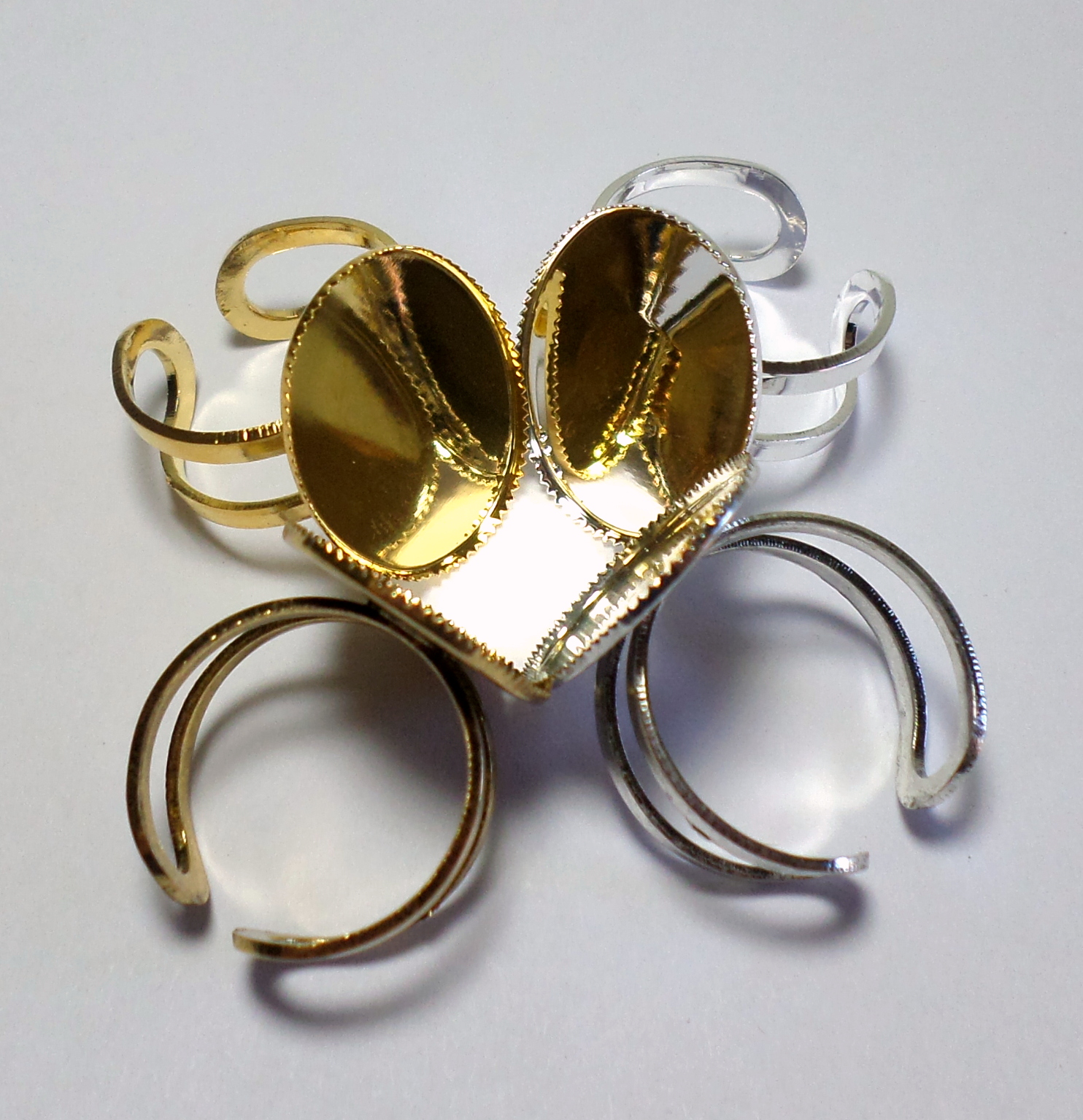 You are buying 4 different Colors of 25 mm x 18 mm Sturdy Adjustable Ring settings. These will work great for any cameos or cabochons, or glass, and will have to be glued in. The biggest size that will fit in these are 25x18 mm. Since they are a solid back, you could go down in size a little if you had an odd size cameo or cabochon to try & fit. These are adjustable from size 7-15. These are lightweight and sturdy. I have lots of Great Bails, Bracelets, Cameos, Chains, Connectors, Jump Rings, Lockets, Pendants, Pins, Rings & Settings so, just look at all my listings. All of these are listed in groups of 4 of each Color. The Antique Gold is item #112415990159, Shiny Gold is item #361988004640, Antique Silver is item #361986859792, and Shiny Silver is item #361987279645. I also have many other styles and sizes of rings so, look at all my listings.