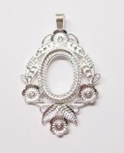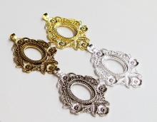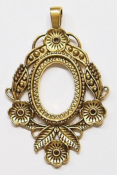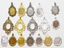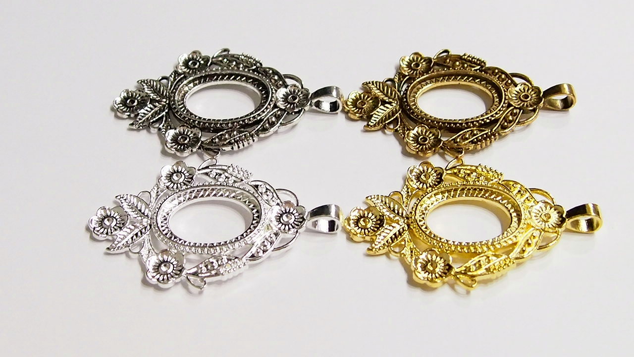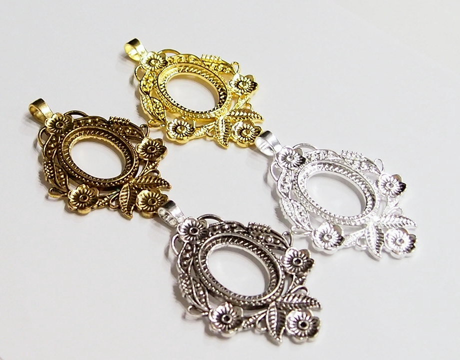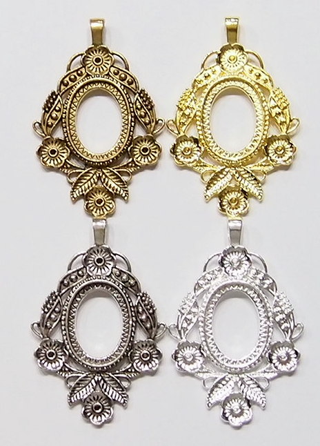 You are buying 4 different Colors of 30 mm x 22 mm flower and leaf design Pendant Settings. You will receive one each Antique Gold, Gold, Antique Silver & Silver, these are all Plated. These settings are absolutely gorgeous with the outside measuring (77 x 50 mm) with a flower and leaf design, and a large bail (8.5 x 6.5 mm) that will fit most any Chain or Cord. You will have to glue in any cameos or cabs you want to put into the setting, no prongs and they are very sturdy. These have never been used. You will not be disappointed in the quality, it is excellent and if I was setting any cameos, cabochons, glass, or whatever you want, I would use these. These are exactly made for 30 mm x 22 mm. They have a beautiful Victorian look to them. I have lots of Great Bails, Bracelets, Cameos, Chains, Connectors, Jump Rings, Lockets, Pendants, Pins, Rings & Settings so, just look at all my listings. These are all offered in groups of 4 of each Color. The Antique Gold is item #111062680438, Shiny Gold item #360646393073, Antique Silver item #111066408795, and the Shiny Silver is item #111066412067. All four of these are included in a group of 17 different Colors of 30x22 mm settings as shown in the last picture item #360471675911, sold separately.