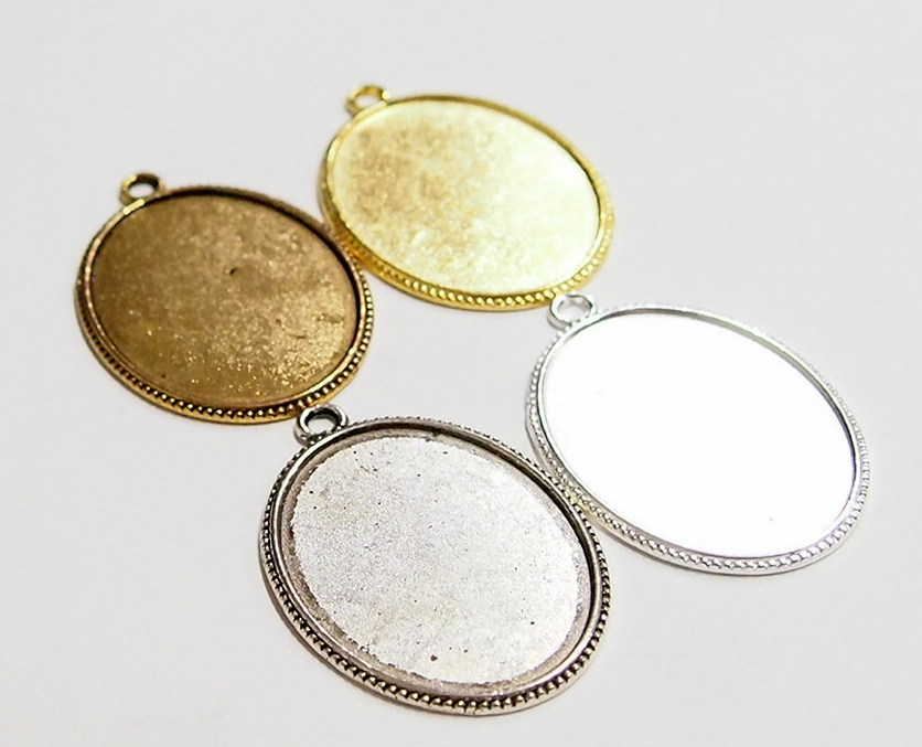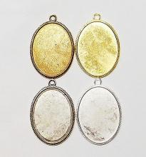 You are buying 4 Colors of 39 mm x 29 mm Oval Beaded Band Pendant Settings. These are very sturdy with a small beaded design around the pendant. You will receive one each Antique Gold, Gold, Antique Silver & Silver, these are all Plated. These will work great for any cameos or cabs, they will have to be glued in. Actual size is a little over 39 mm x 29 mm which means you could use a 40x30 mm Resin Cameo you have to file it down just a bit. The biggest size that will fit in these are 39 x 29 mm. Since they are a solid back, you could go down in size a little if you had an odd size cameo or cab to try & fit. They have never been used, very nice looking. I have lots of Great Bails, Bracelets, Cameos, Chains, Connectors, Jump Rings, Lockets, Pendants, Pins, Rings & Settings so, just look at all my listings. These are all offered in groups of 4 of each Color. The Antique Gold is item #360643418077, Shiny Gold is item #111059300964, Antique Silver is item #111066481563, and the Shiny Silver is item #111066485127. I have a similar set of 4 colors of 40x30 mm Oval Rope Edge Pendant Settings item #110911244561 as shown in the last picture sold separately.