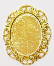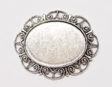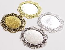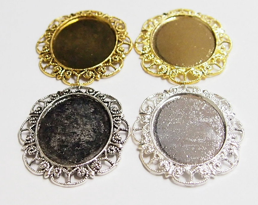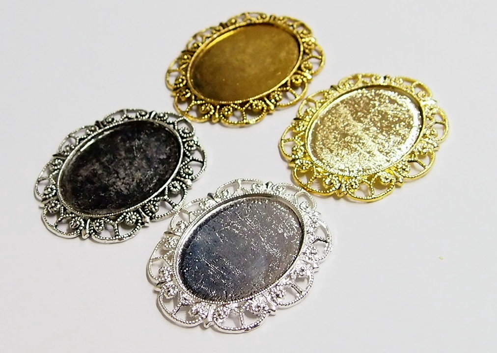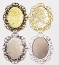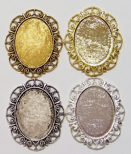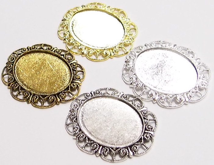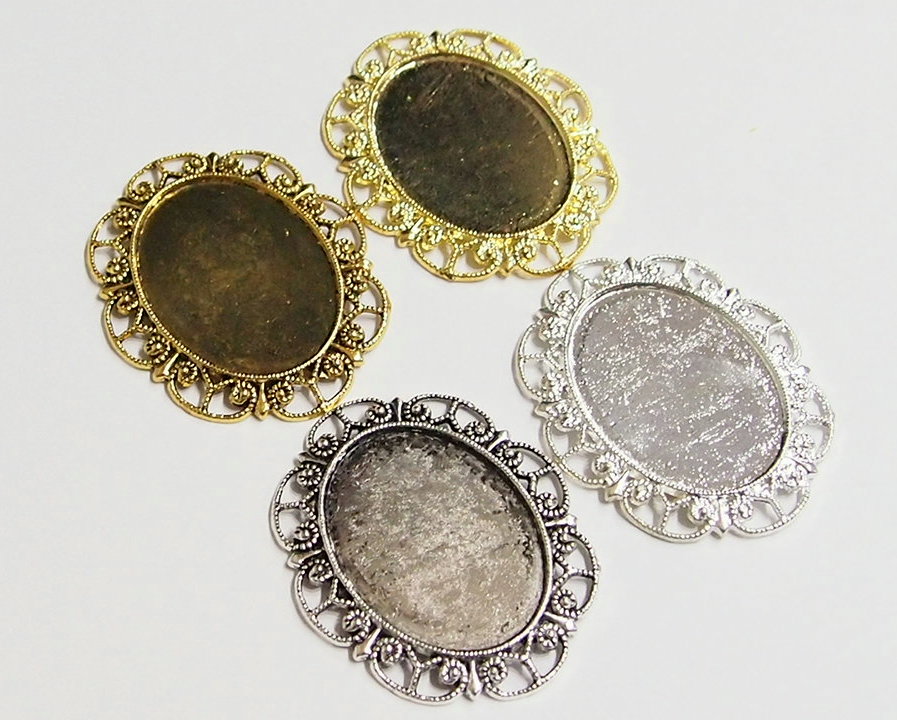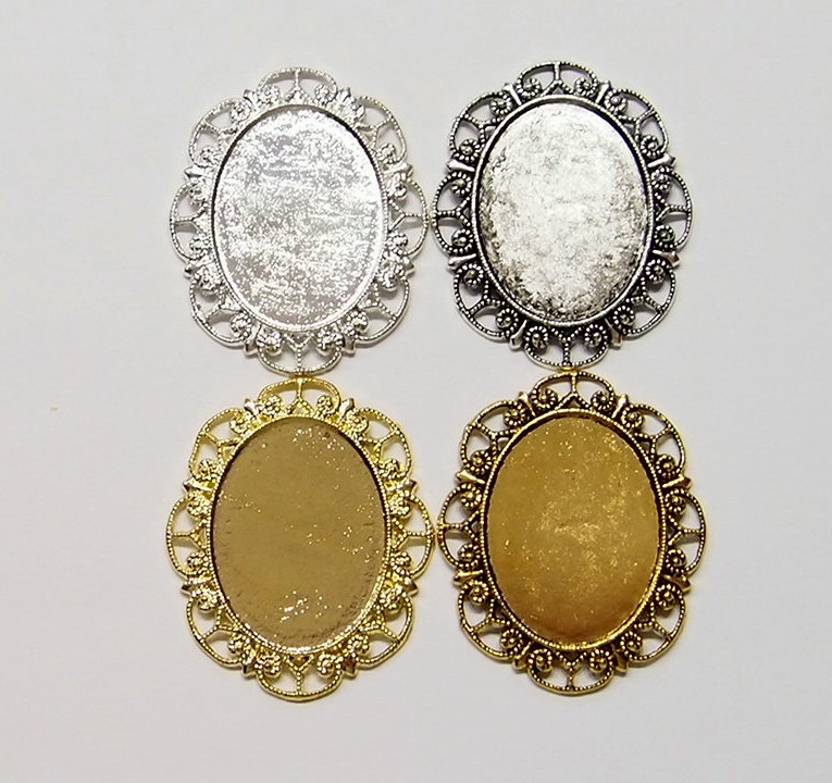 You are buying 4 Colors of 40 mm x 30 mm Delicate Lace Design Pendant Settings. You will receive one each Antique Gold, Gold, Antique Silver & Silver, these are all plated. You can use the lace on the pendant to put your Chain or Cord or Jump Ring (which I have 3 Colors & 2 Sizes of) through and you can always add a pin on the back if you desire a brooch too. These settings are really gorgeous, big lace pattern all around it. You can use these either Horizontal or Vertical. The back side is really nice with a star burst pattern on it, you could glue another cameo or cab on the back side and have a double sided pendant. Since they are a solid back, you could go down in size a little if you had an odd size cameo or cab to try & fit. You will not be disappointed in the quality, it is excellent and if I was setting any cameos or cabochons, I would use these. These have never been used. Cameos or cabochons will have to be glued in, no prongs. I have lots of Great Bails, Bracelets, Cameos, Chains, Connectors, Jump Rings, Lockets, Pendants, Pins, Rings & Settings so, just look at all my listings. These are all offered in groups of 4 of each Color. The Antique Gold is item #360471675556, Shiny Gold item #110930805579, Antique Silver item #110911242453, and the Shiny Silver is item #360478420759. I have lots of other settings like this in other sizes so give them all a look.