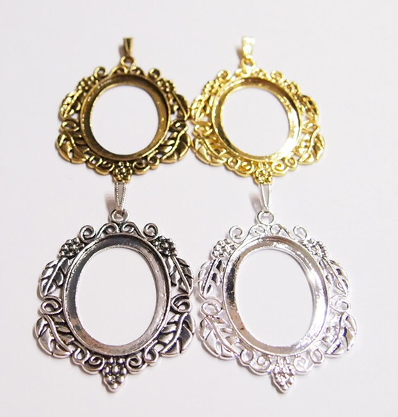 You are buying 4 different Colors of 40 mm x 30 mm Grape & Leaf Pattern Pendant Settings. You will receive one each Antique Gold, Gold, Antique Silver & Silver, these are all Plated. The outside measures 61 x 46 mm including the loop at the top. The top has a nice size loop (3.6 mm) for your Chain or Cord or Jump Ring (which I have 3 Colors & 2 Sizes of). Also included with these is a swivel bail. You will not be disappointed in the quality, it is excellent and if I was setting any cameos or cabochons or glass, I would use these. These are glue in setting and are very sturdy. These are much sturdier than the other ones you will find that looks exactly like this, I had these made. These pendants are in the Victorian grape and leaf pattern, very pretty, really Victorian looking. These are really nice and will accent anything you put in them. These have never been used. These are exactly made for 40 mm x 30 mm, no other size will fit. I have lots of Great Bails, Bracelets, Cameos, Chains, Connectors, Jump Rings, Lockets, Pendants, Pins, Rings & Settings so, just look at all my listings. All of these are offered in groups of 4 of each color. The Antique Gold is item #360481657888, Shiny Gold item #110941401240, Antique Silver item #360481659432, and the Shiny Silver plated is item #360483136342. I have lots of other settings in several styles and sizes so give them all a look.