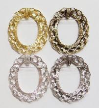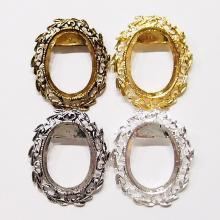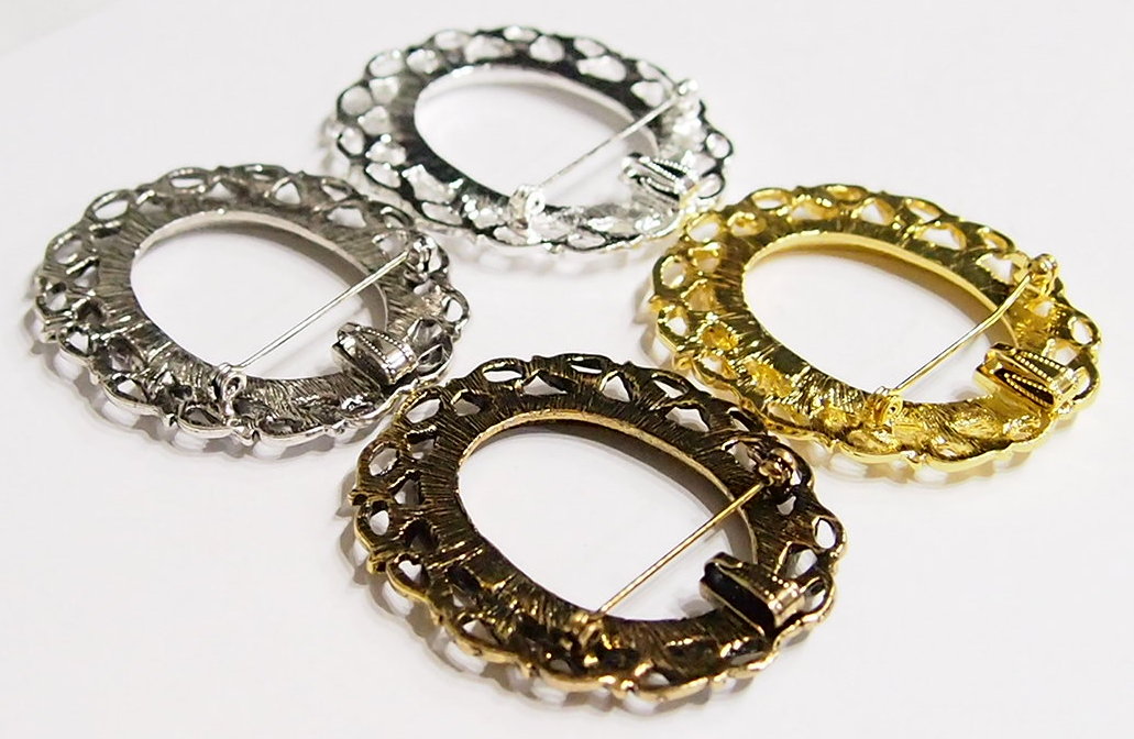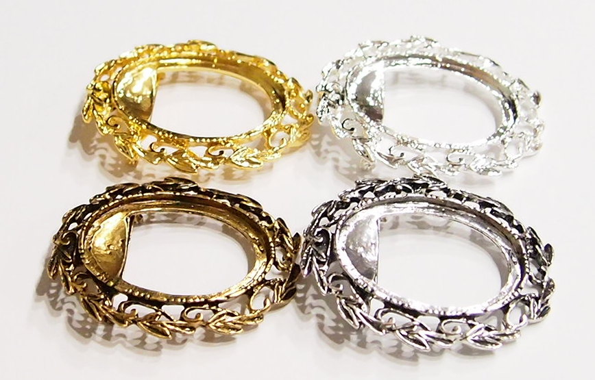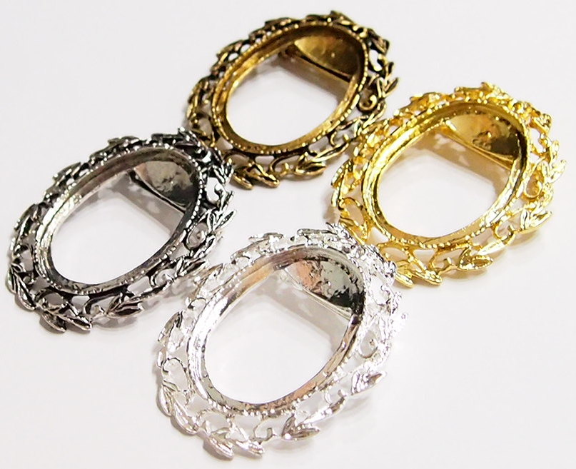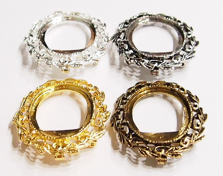 You are buying 4 Colors of 40 mm x 30 mm Old Style Leaves Wreath Pin/Pendant Settings. You will receive one each Antique Gold, Gold, Antique Silver & Silver, these are all Plated. These settings are originally from the 1900-1930's, I only had a few left and found a company to make these for me and they are gorgeous. These have a pin setting near the top and a bail too, so you can use them either way. The pattern is the Old Style Leaves Wreath design. The design is just delicate, but they are very solid, not flimsy like the new ones are. You will not be disappointed in the quality, it is excellent and if I was setting any cameos or cabs, I would use these. These have a locking latch. These will work great for any cameos or cabs, they will have to be glued in. I have lots of Great Bails, Bracelets, Cameos, Chains, Connectors, Jump Rings, Lockets, Pendants, Pins, Rings & Settings so, just look at all my listings. All of these are offered in groups of 4 of each color. The antique gold is item #360483121488, gold is item #110941467504, antique silver is item # 360483157217, and the silver is item # 360483155788.