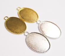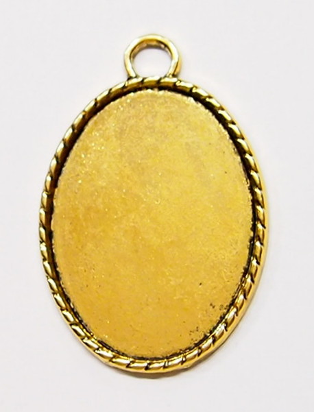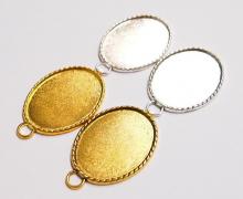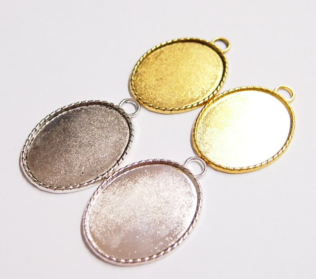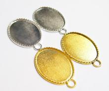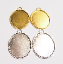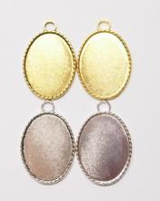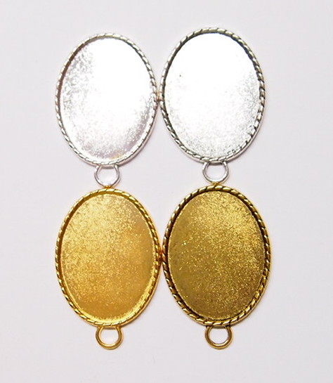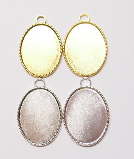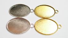 You are buying 4 Colors of 40 mm x 30 mm Oval Small Rope Edged Pendant Settings. You will receive one each Antique Gold, Gold, Antique Silver & silver, these are all Plated. These have a great rope looking edge all the way around these beautiful settings. These settings are originally from the 1900-1930's, I only had a few left and found a company to make these for me and they are gorgeous. The design is just fabulous, they are very solid, not flimsy like the new ones are. You will not be disappointed in the quality, it is excellent and if I was setting any Cameos or Cabs, I would use these. The 40x30mm have a nice big loop at the top and you can always add a pin on the back if you desire a broach too. The back side is really nice with a star burst pattern on it, you could glue another cameo on the backside and have a double sided Pendant. These will work great for any cameos or cabs, they will have to be glued in. I have lots of Great Bails, Bracelets, Cameos, Chains, Connectors, Jump Rings, Lockets, Pendants, Pins, Rings & Settings so, just look at all my listings. All of these are offered in groups of 4 of each color. The Antique Gold is item #110911255141, Shiny Gold is item #360471675550, Antique Silver is item # 360478420851, and the Shiny Silver is item #360471675555.