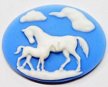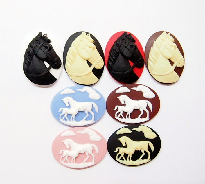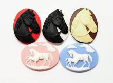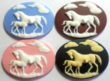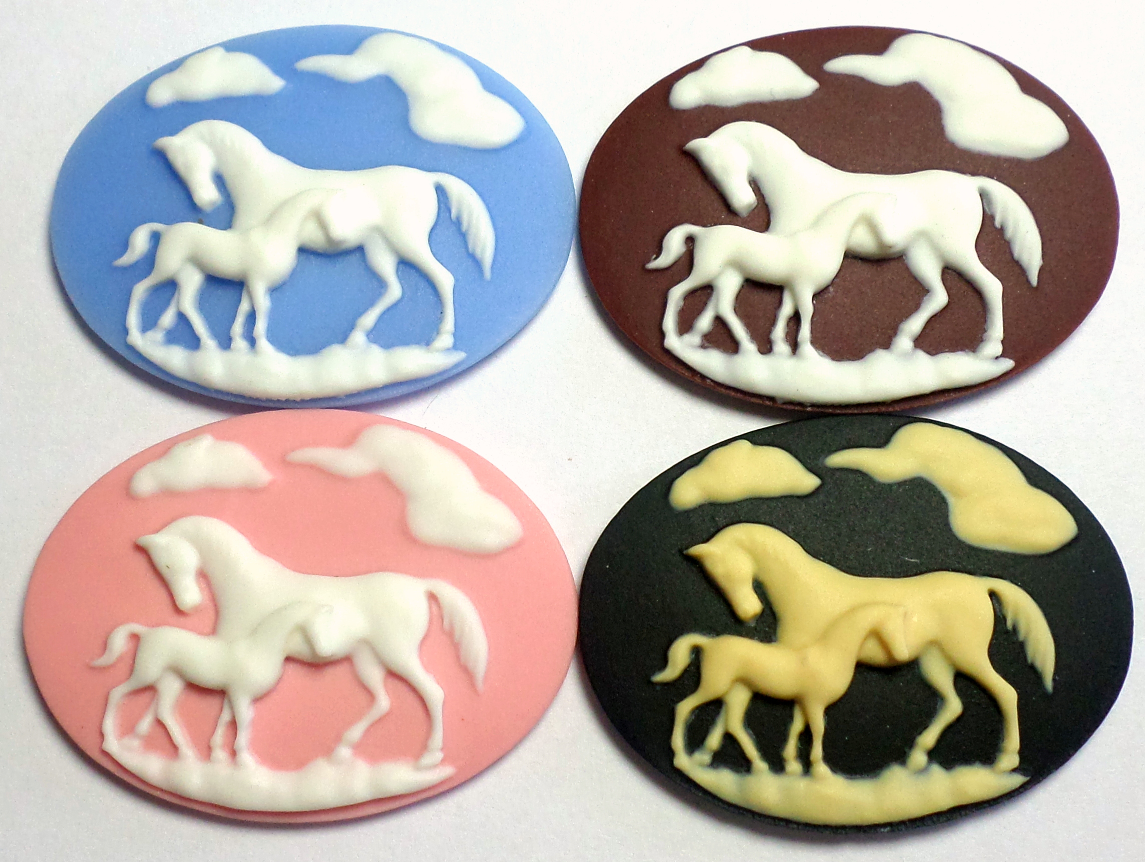 You are buying 4 different Colors of 40 mm x 30 mm Horizontal Horse & Colt Cameos. These are of a Beautiful Female (Mare) or (Stud) Horse with baby Colt standing beside, these are molded. The image stands out from the cameo to give them the 3-d effect. They measure 40 mm x 30 mm & are Horizontal in orientation. They look very detailed for their size. I have lots of Great Bails, Bracelets, Cameos, Chains, Connectors, Jump Rings, Lockets, Pendants, Pins, Rings & Settings so, just look at all my listings. All of these are offered in groups of 4 of each Color. The white over blue is item #361948434683, the white over brown is item #111934150223, the white over pink is item #110911248656 and the cream over black is item #111956853445 and the group of 8 as shown in the next to last picture is item #111956841273, sold separately. I also offer a group of 5 different 40x30 mm Colors of horse cameos as shown in the last picture item #111172970962, sold separately.